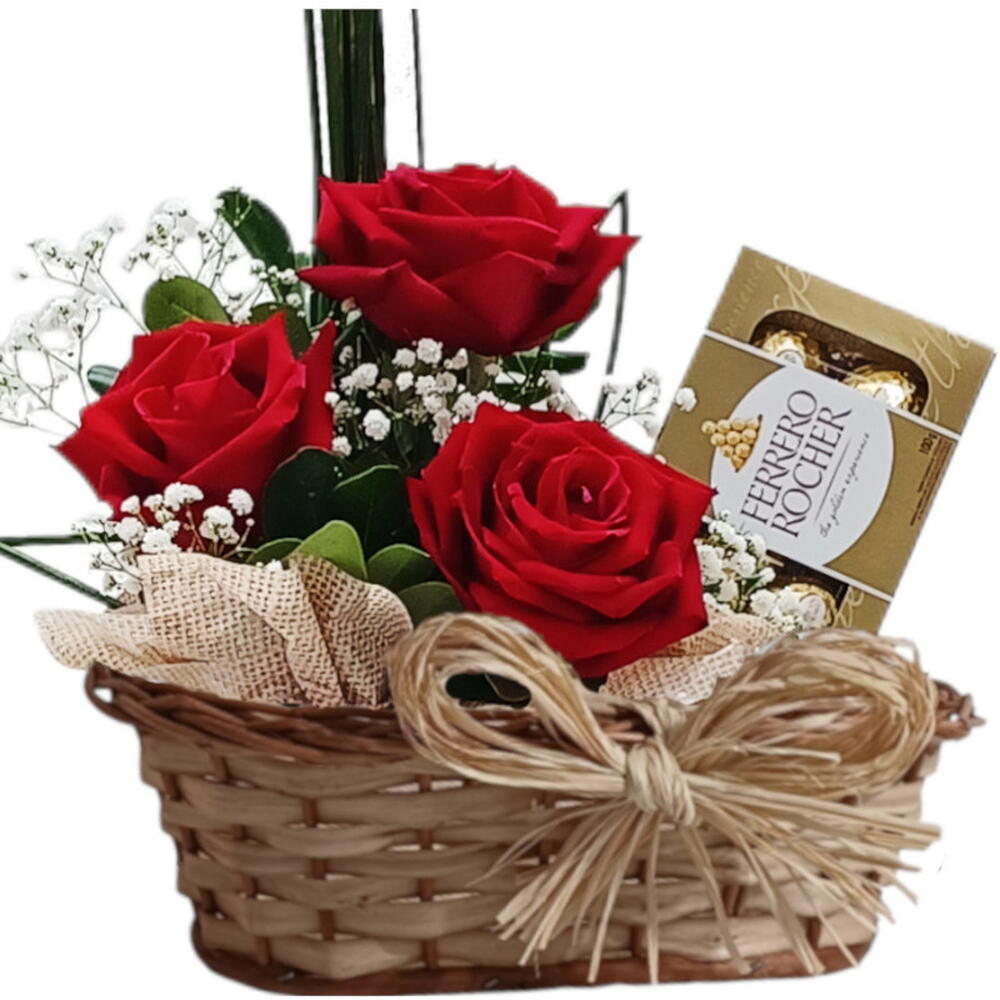 3 ROSAS NA CESTA DUPLA DE VIME E CAIXA DE BOMBOM FERRERO ROCHER DE 8 UNIDADES