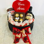 Lindo Box Preto com Coração de Pelúcia Bordado ( temos outras opções de frases), Garrafa Pequena de Vinho Tinto Quinta do Morgado, Nutella, Bombons Raffaello e Caixinha Especial com Bombons Ferrero Rocher. Entregamos Embalado e com Laço Especial.