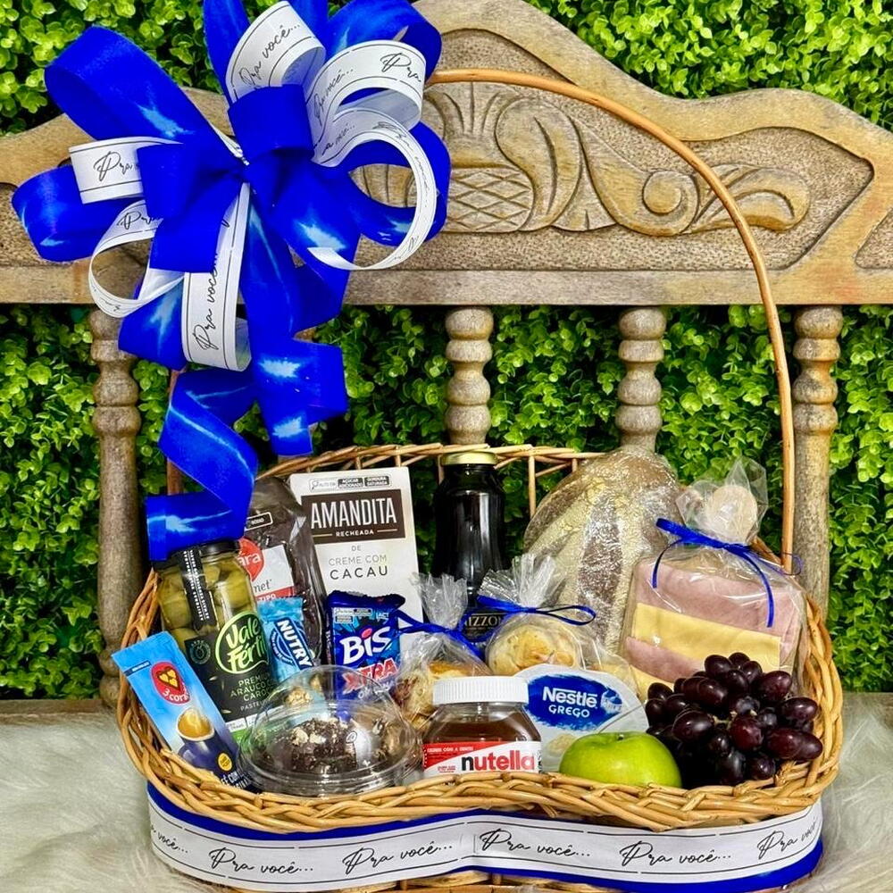 nutella 140gr - 1 un. iogurte grego - 1 un. queijo e presunto - 1 un. bis extra - 1 un. uvas sem semente - 1 un. cappuccino 3 corações - 1 un. maçã importada - 1 un. barra nutry - 1 un. tortelete - 1 un. salame tipo italiano fatiado seara 100gr - 1 un. laço artesanal - 1 un. suco uva integral 500ml garibaldi - 1 un. 2 tipos salgados assados - 2 un. azeitonas sem caroço - 1 un. plástico selofane - 1 un.