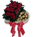 Surpreenda quem você ama com este presente romântico e irresistível! Dez rosas vermelhas vibrantes, cuidadosamente arranjadas em uma bandeja em forma de coração, criam um cenário apaixonante. Para completar a experiência, 12 unidades do irresistível chocolate Ferrero Rocher adicionam um toque de luxo e sofisticação. Um presente perfeito para aniversários, Dia dos Namorados ou qualquer ocasião especial que mereça uma demonstração de amor inesquecível. Demonstre o seu amor com elegância e sabor!