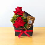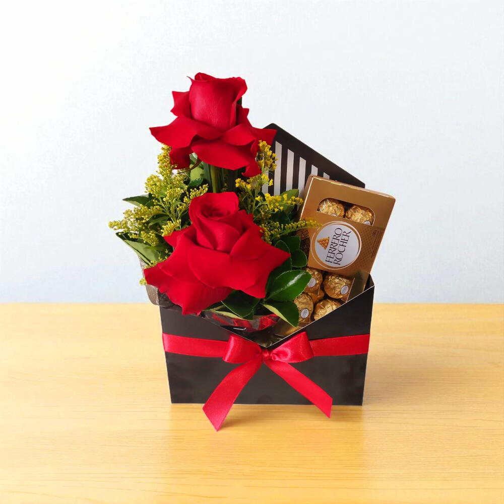 Este conjunto de flores e chocolates apresenta um dueto de belíssimas rosas colombianas, complementado com seis unidades de folhagem verde, criando uma paisagem floral elegante e vibrante. Uma luxuosa caixa de chocolates Ferrero Rocher de 100g está inclusa para adoçar o presente e proporcionar um completo deleite sensorial. Tudo é embalado de maneira primorosa em uma caixa de envelope cartonada, garantindo um cuidado extra e aprimoramento do belo conjunto. Ideal para ocasiões especiais ou simplesmente para fazer alguém se sentir amado.