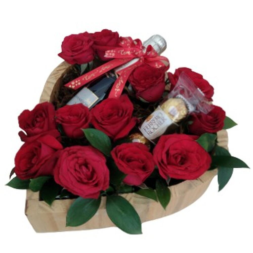 Surpreenda alguém especial com este encantador arranjo de 12 rosas acompanhado por um elegante baby Chandon, deliciosos chocolates Raffaello ou Ferrero Rocher e uma bandeja em formato de coração. Uma combinação perfeita para expressar seu amor e carinho.