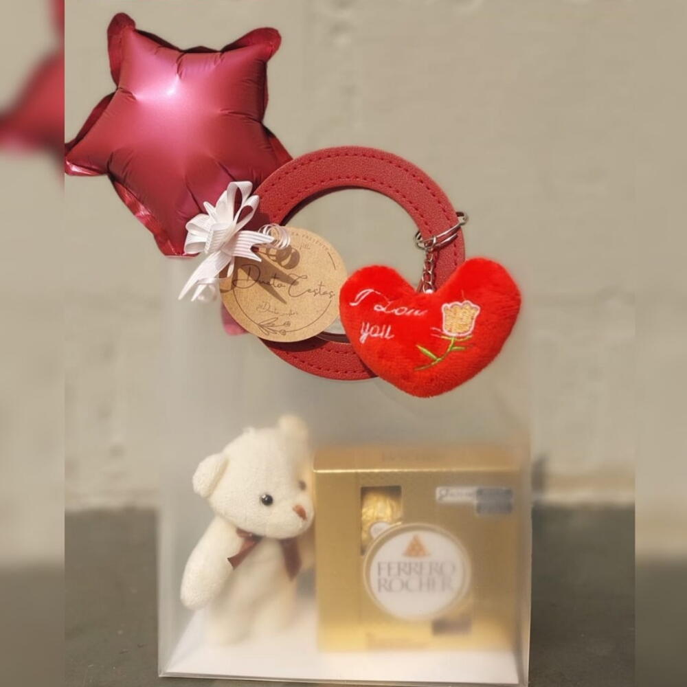 ferrero rocher 4 un - 1 un. balão decorativo - 1 un. pelucia chaveiro coração - 1 un. pelucia chaveiro ursinho - 1 un. bag com alça redonda bordo - 1 un.