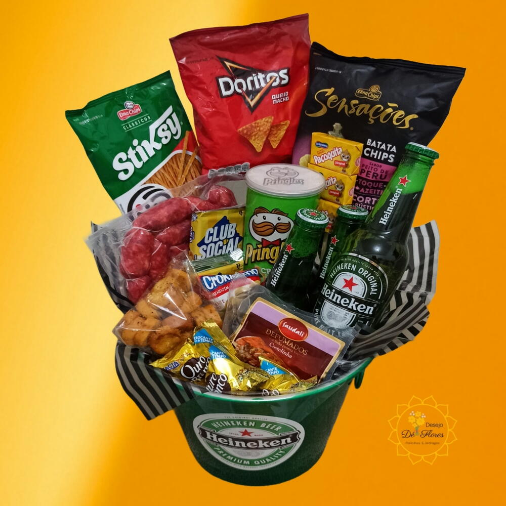 Opção incrível de presente pra quem adora uns petisquinhos e uma boa cerveja. Contém 20 itens para alegrar o dia de quem você ama. Itens: 3 long Heineken Torradas artesanal Linguiça mineira Costelinha Defumada (pronta para consumo) Pringles Doritos Chips Sensação Palitinhos stinksy Club social sabores Amendoim Paçoquinhas Bombons Ouro Branco Balde alumínio Heineken