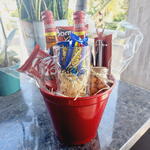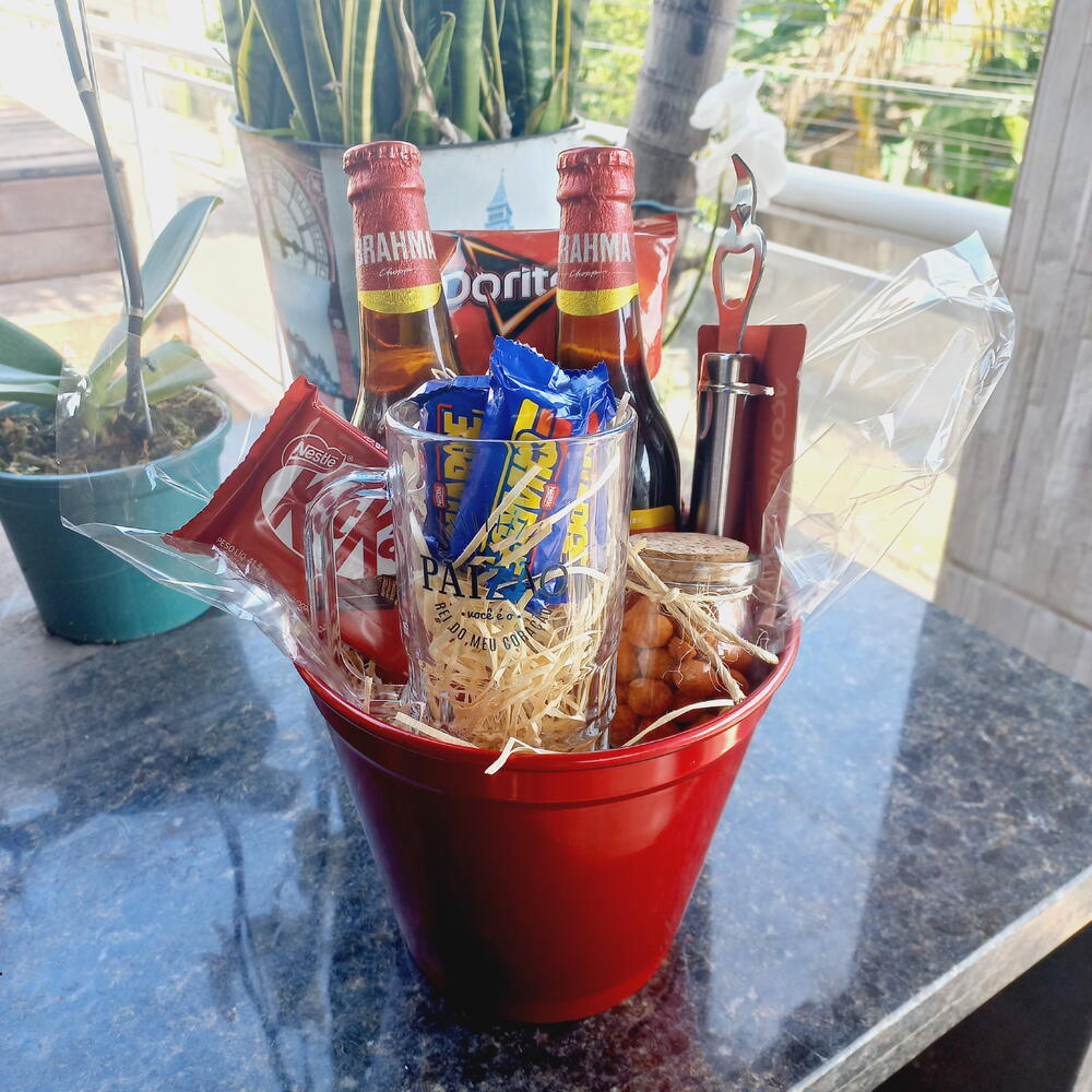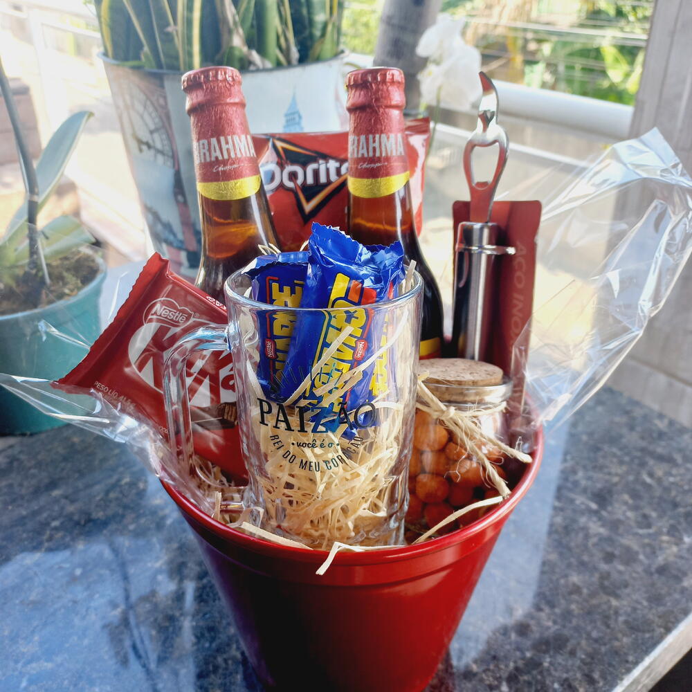 kit kat - 1 un. doritos - 1 un. caneca de vidro - 1 un. balde de alumínio - 1 un. longnek brahma - 2 un. abridor estiloso - 1 un. pontinho de vidro de amendoim - 1 un. charges - 4 un.
