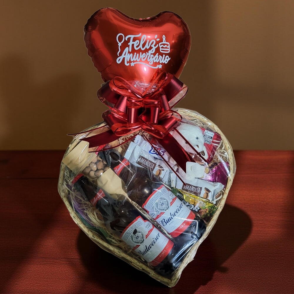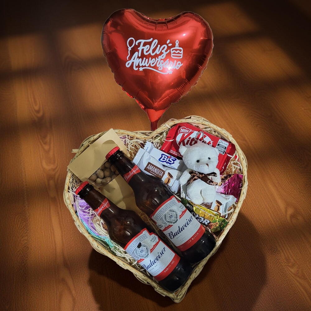 🎁 **Cesta de Aniversário Especial** 🎈 Surpreenda com esta charmosa cesta em formato de coração, perfeita para celebrar momentos inesquecíveis! ✨ **Conteúdo da Cesta:** * Balão vermelho em forma de coração com a mensagem Feliz Aniversário * Duas garrafas de cerveja Budweiser, para brindar à vida * Deliciosos chocolates, incluindo Kit Kat e Bis * Doce Amandita para adoçar ainda mais a comemoração * Um adorável urso de pelúcia branco, para um toque de carinho * Pequeno saco de amendoins ou castanhas, para um petisco saboroso Esta cesta é a combinação perfeita de amor e diversão, ideal para surpreender quem você ama! 🌟 **Personalização:** Modificamos a tag e o balão para atender qualquer ocasião! Aniversários, Dia das Mães, Natal ou apenas para dizer eu te amo!