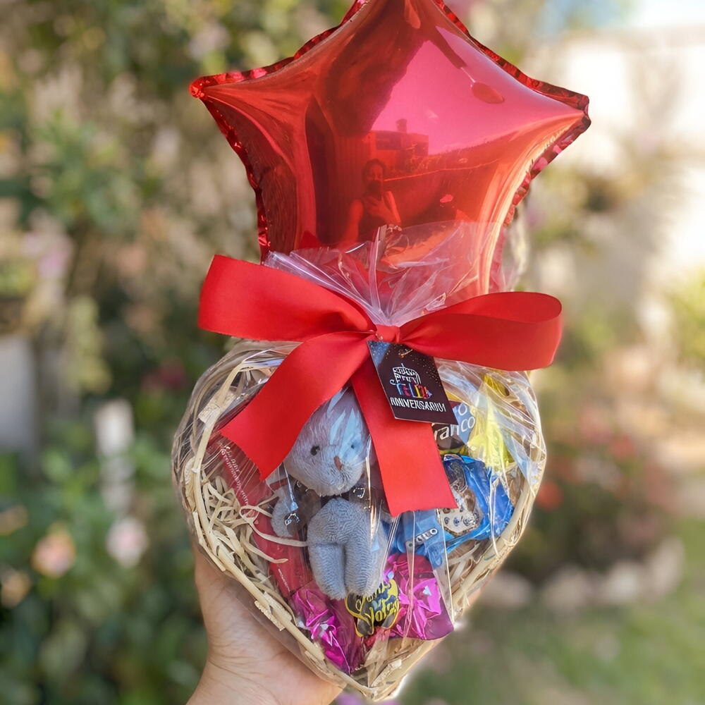 cartão personalizado - 1 un. ursinho chaveiro 11cm - 1 un. kit kat - 1 un. balão decorativo - 1 un. bandeija de coração mdf - 1 un. sacola presenteavel - 1 un. laço grande de fita vermelha - 1 un. chocolate sorrisos - 3 un.
