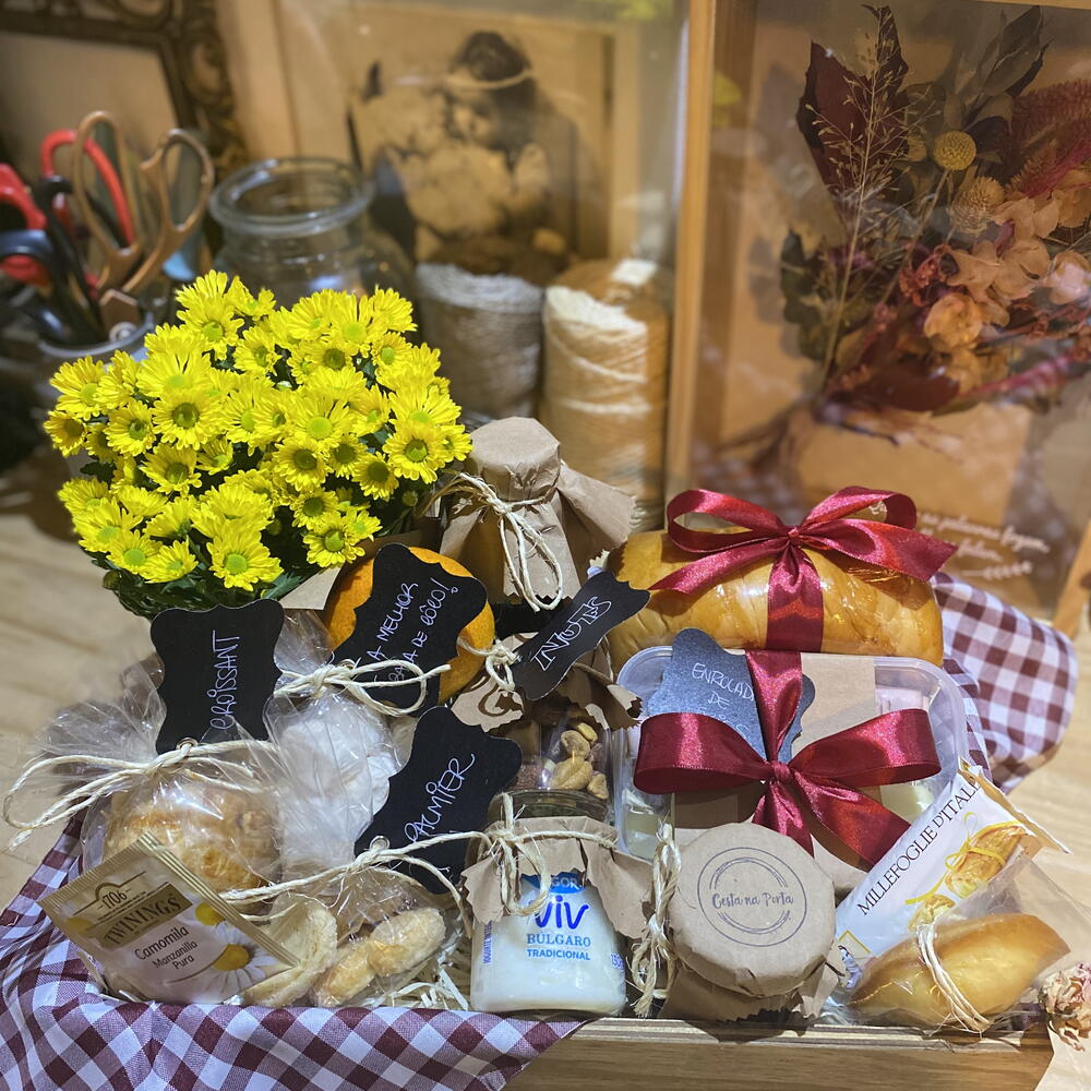 croissant - 1 un. iogurte - 1 un. maçã - 1 un. cesta - 1 un. chá twinings - 1 un. geléia - 1 un. suco de uva integral - 1 un. pão caseiro - 1 un. flor plantada - 1 un. madeleine - 1 un. laço rústico - 1 un. laço em cetim - 1 un. tecido decorativo - 1 un. enroladinho queijo - 1 un. enroladinho peito peru - 1 un. folhado doce - 1 un. foundant - 1 un. granola no vidro gourmet - 1 un.
