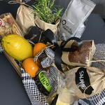 embalagem - 1 un. maçã - 1 un. salame - 1 un. bolo - 1 un. geleia - 1 un. mel - 1 un. mamão papaya - 1 un. queijo colonial - 1 un. pão rústico - 1 un. biscoito cracker - 1 un. laço rústico - 1 un. café gourmet - 1 un. laço em cetim - 1 un. tecido decorativo - 1 un. muda de alecrim - 1 un. cuca - 1 un. iogurte shot - 1 un.