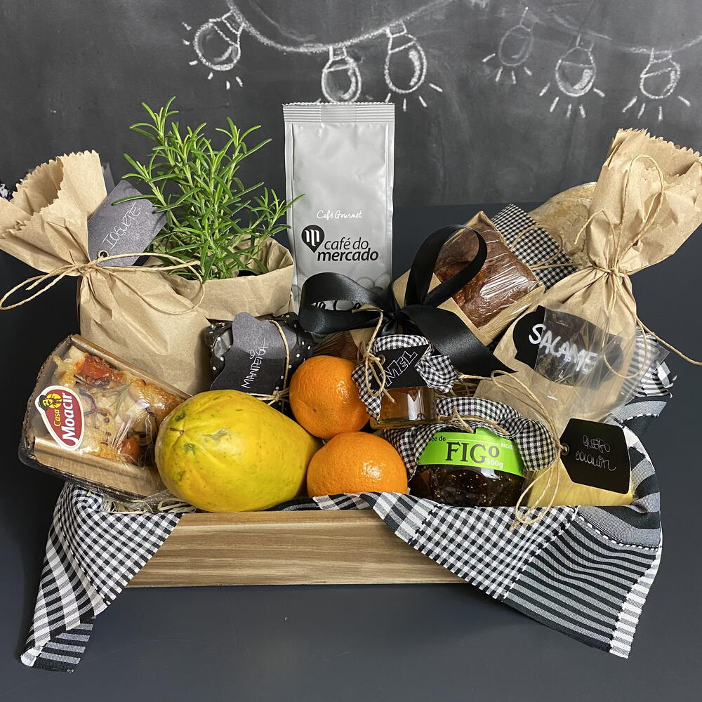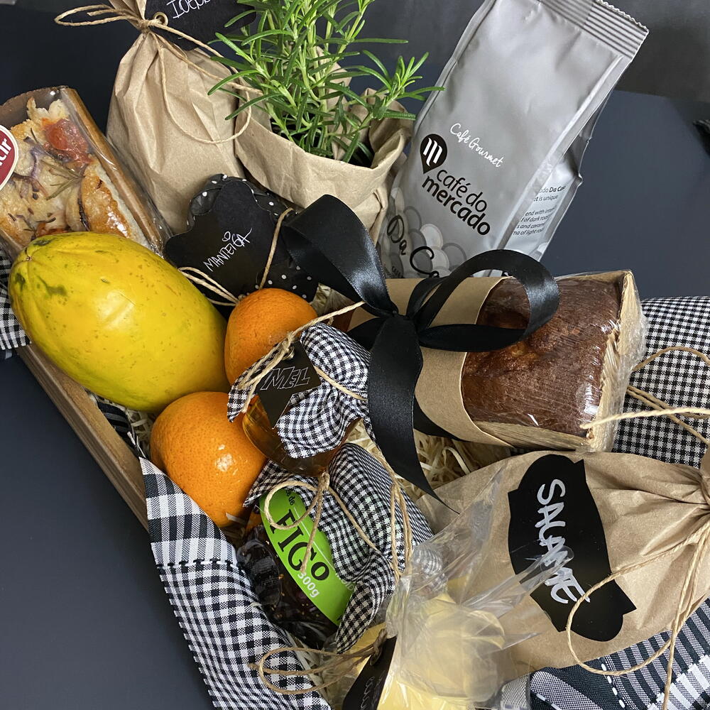 embalagem - 1 un. maçã - 1 un. salame - 1 un. bolo - 1 un. geleia - 1 un. mel - 1 un. mamão papaya - 1 un. queijo colonial - 1 un. pão rústico - 1 un. biscoito cracker - 1 un. laço rústico - 1 un. café gourmet - 1 un. laço em cetim - 1 un. tecido decorativo - 1 un. muda de alecrim - 1 un. cuca - 1 un. iogurte shot - 1 un.