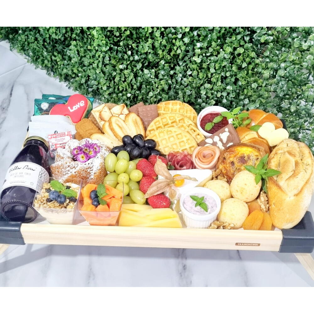 frutas - 1 un. croissant - 1 un. iorgute - 1 un. suco - 1 un. frios - 1 un. pão de mel - 1 un. bolo - 1 un. manteiga - 1 un. geleia - 1 un. pão de queijo - 1 un. cappuccino - 1 un. waffle - 1 un. drip coffee - 1 un. biscoito folhado - 1 un. queijo brie - 1 un. queijo gouda - 1 un. pate - 1 un. biscoito amantegado - 1 un. bandeija tramontina com pé - 1 un. baguete de alecrim - 1 un. biscoito decorado com carinho - 1 un.