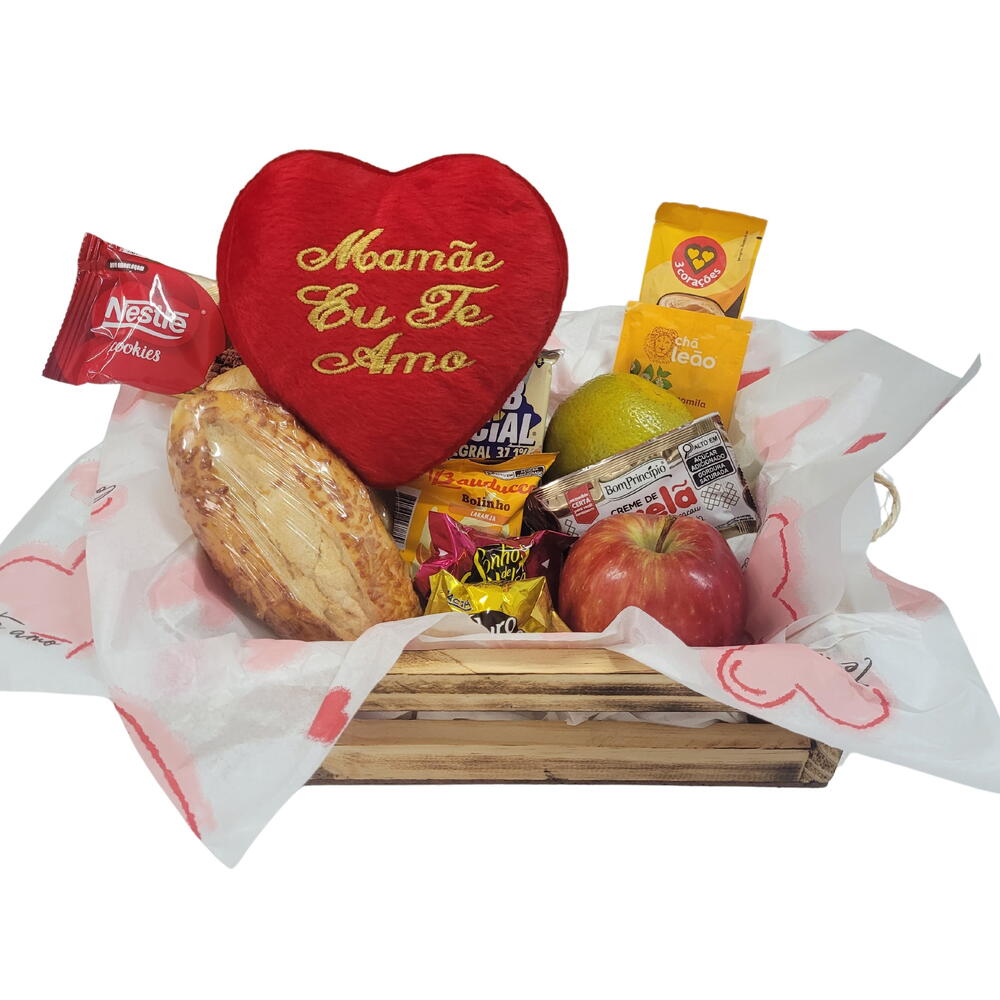 Bandeja Mãe Dia Especial 1 Bandeja em Madeira Rústica 1 Pelúcia Coração (frases variadas) 2 Bombons Sonho de Valsa/Ouro Branco/Serenata do Amor 2 Variedades de Pães 1 Pacote de Cookies 1 Bolacha Club Social 1 Sache de Creme de Avelã com Cacau 1 Unidade de Polenguinho 1 Bolinho Bauducco 2 Frutas da Época 1 Suco de Frutas 2 Saches de Açúcar 1 Sache de Capuccino ou Café Solúvel 1 Sache de Chá 1 Cartão de Brinde 1 Pacote Transparente 1 Laço Obs.: - Na falta de algum item o mesmo poderá ser substituído por outro de igual valor e qualidade. - A cor da decoração poderá variar de acordo com a disponibilidade do dia.