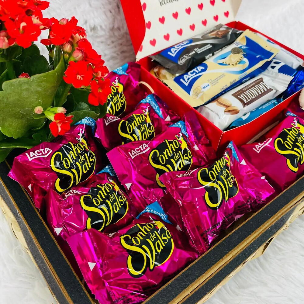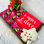caixa de chocolate - 1 un. bombons - 8 un. flor kalanchoe - 1 un. chaveiro de ursinho de pelúcia - 1 un. bandeja p - 1 un. embrulho transparente - 1 un.