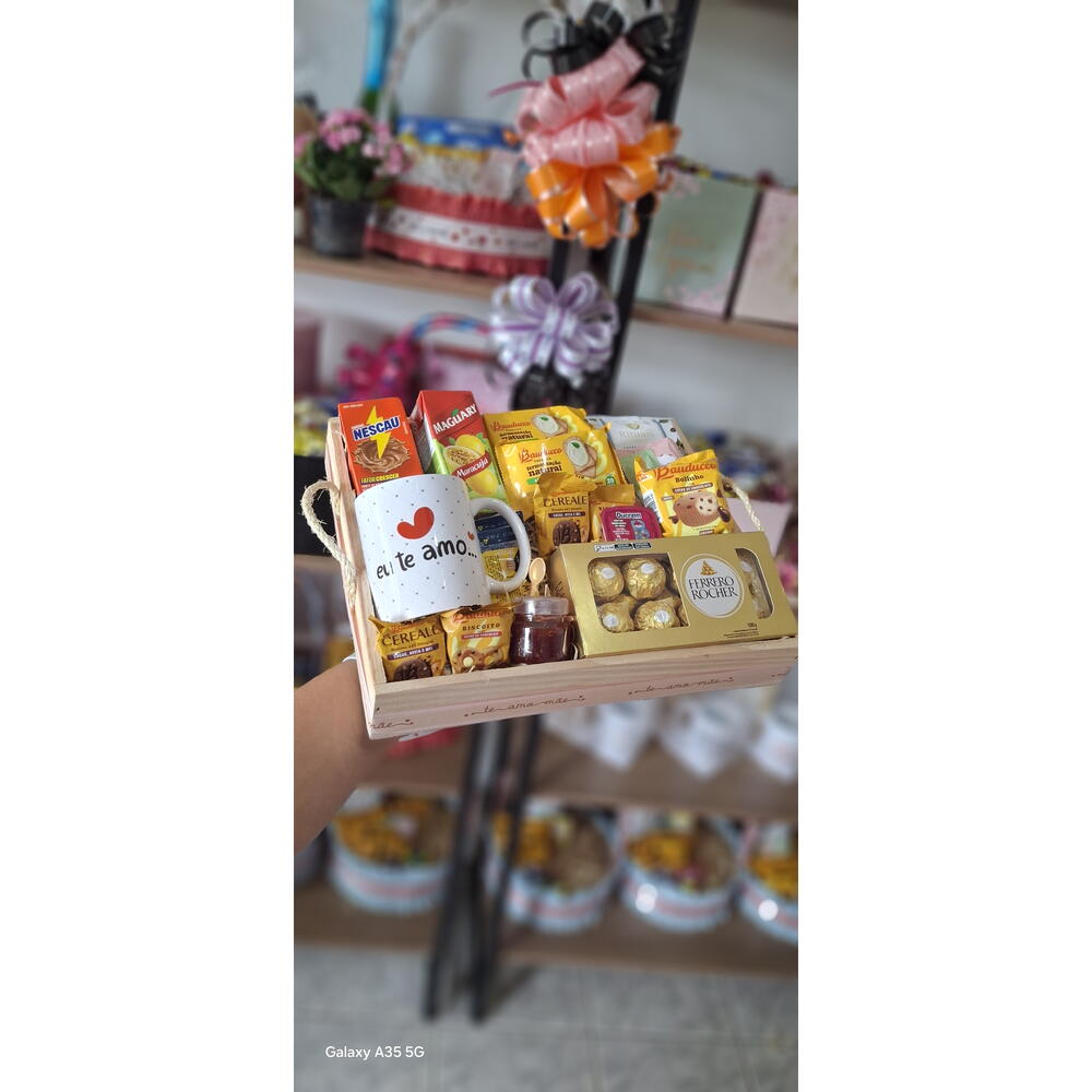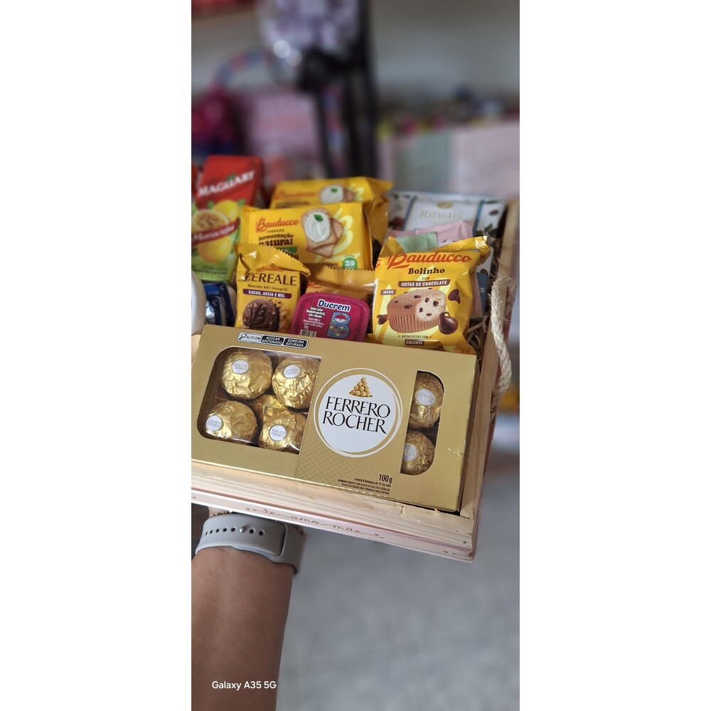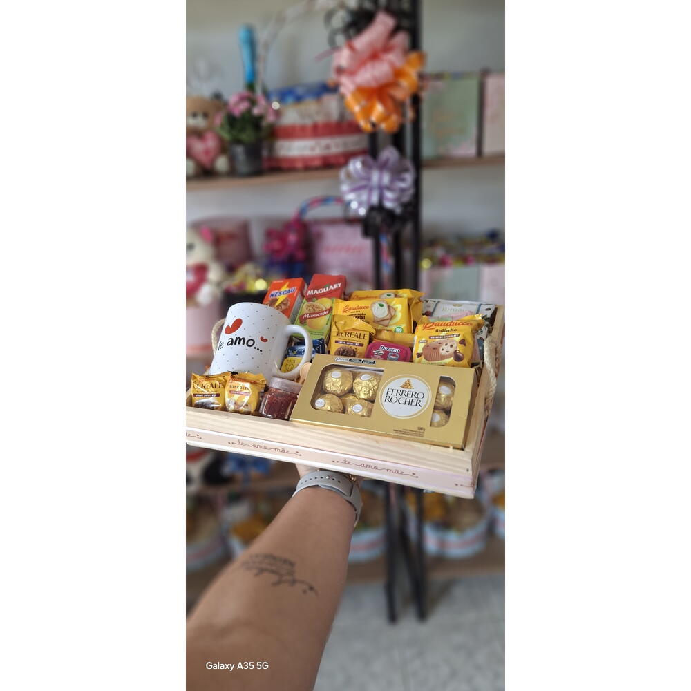 laço - 1 un. bandeja - 1 un. mini manteiga - 2 un. biscoito amanteigado que derrete na boca - 2 un. embalagem celofane - 1 un. biscoito amanteigado de banana com canela bauducco 11 - 2 un. mel individuais blister - 1 un. ferrero rocher 8 un - 1 un. coffe drip - 1 un. achocolatado ou suco (caixinha) - 2 un. torradas slim tost - 2 un. geleia artesanal pasta do dia - 50 ml caneca porcelana dia das mães - 1 un.