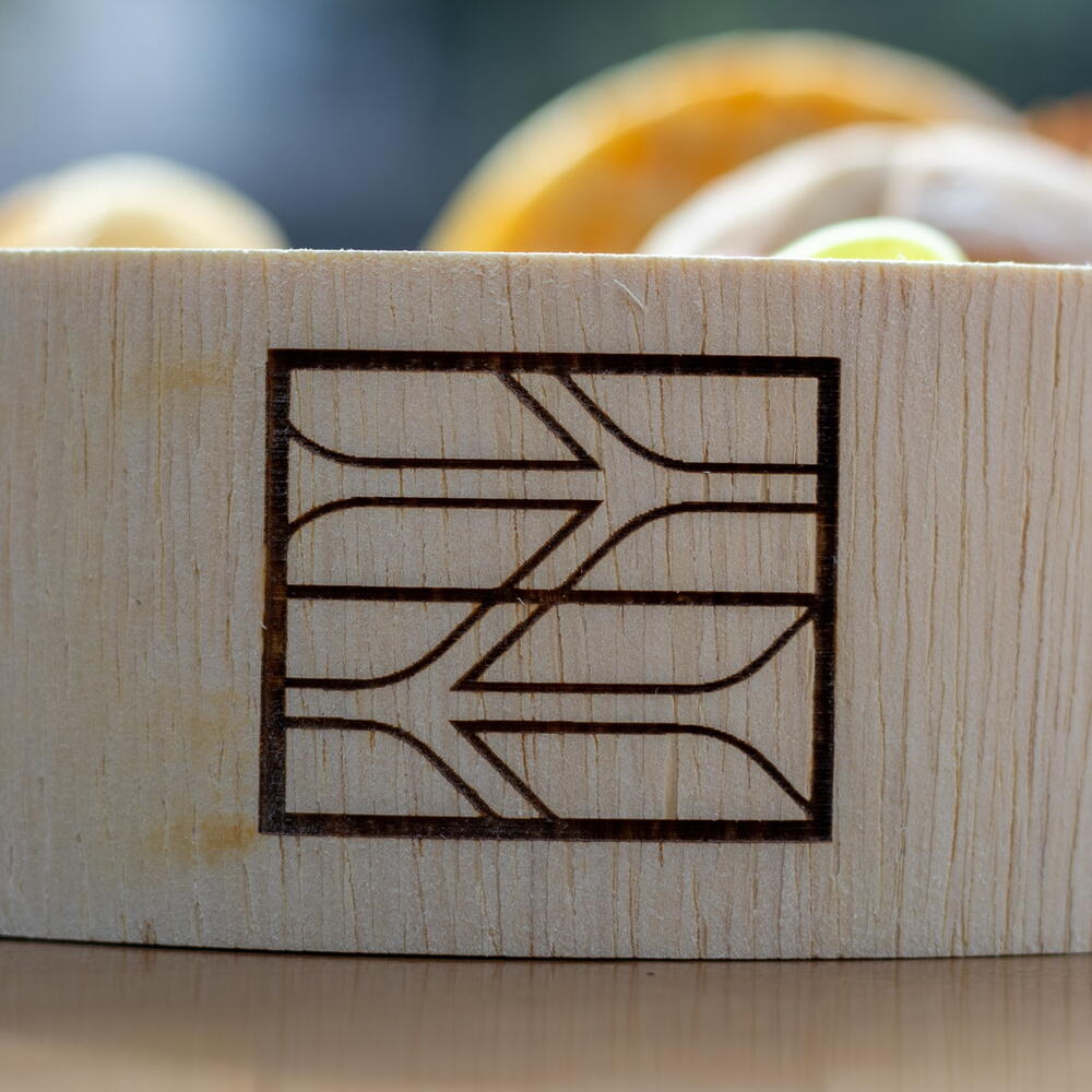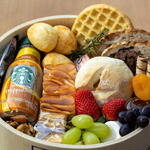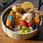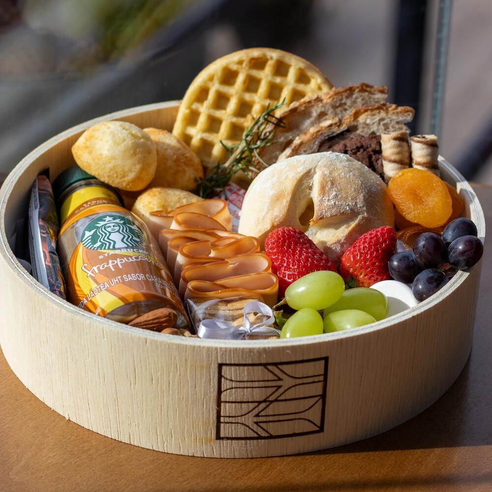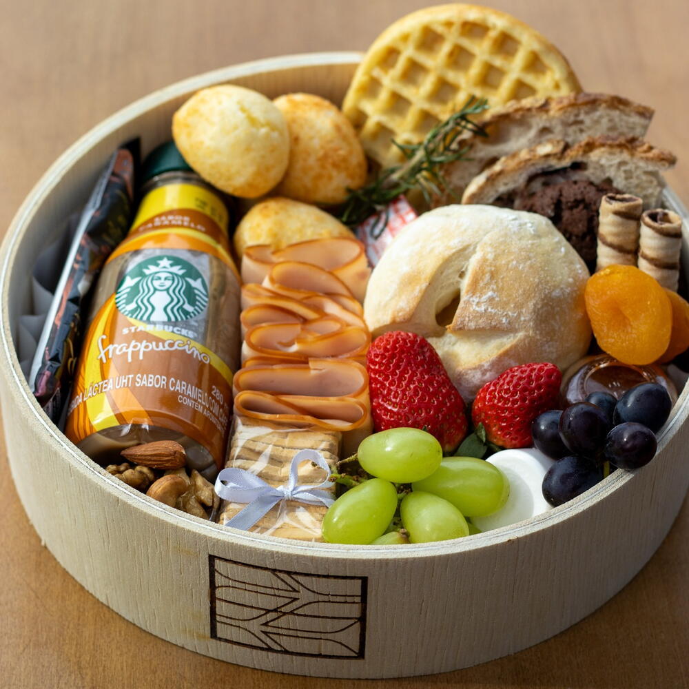 Bandeja redonda de madeira personalizada com pão, torradas, waffle, biscoitinhos; queijos e frios, frutas, nuts, suco, geléia artesanal e requeijão Ideal para 1-2 pessoas.
