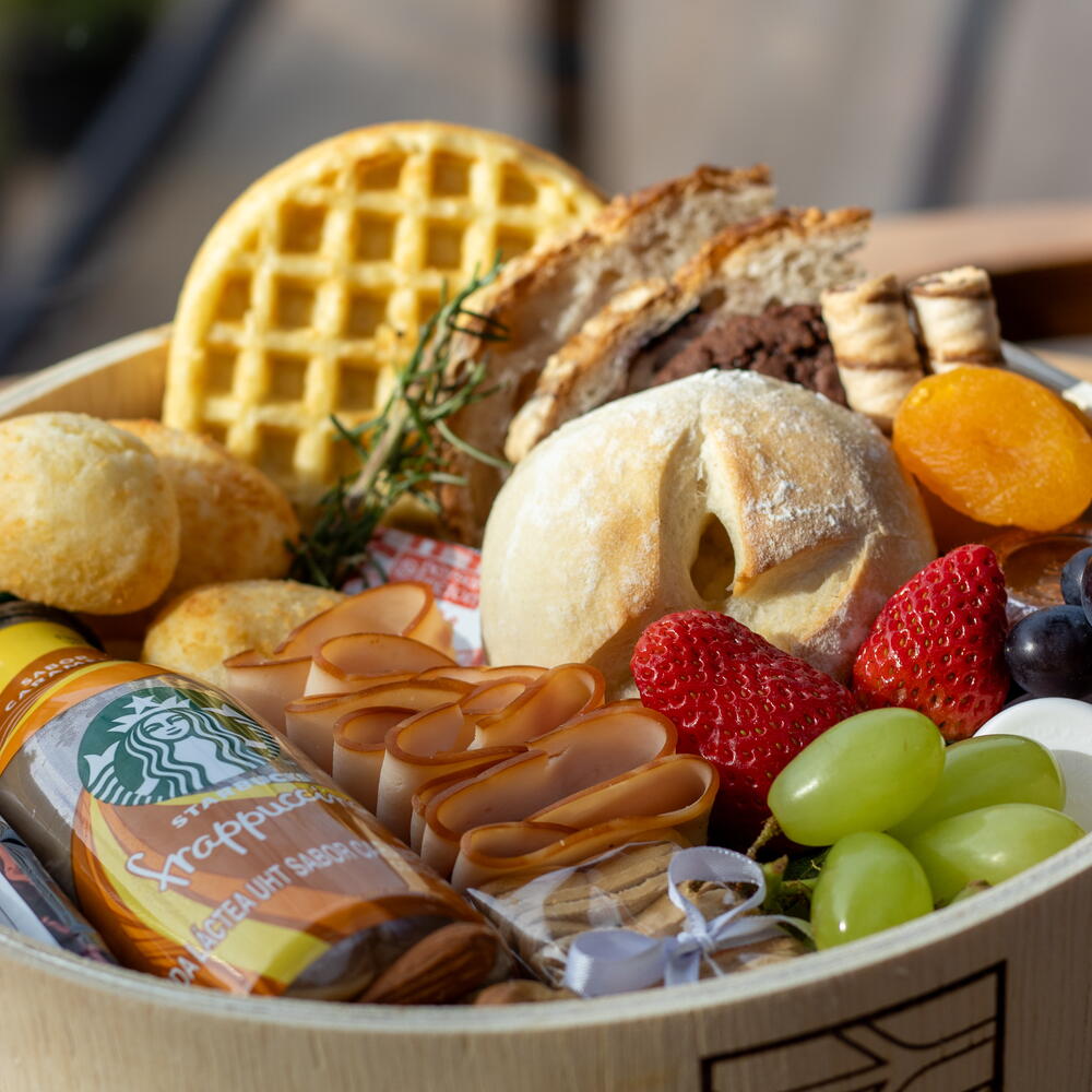 pão de queijo - 4 un. cookie - 1 un. mini geleia - 1 un. damasco turco - 2 un. mix de frutas - 1 un. biscoito wafer - 2 un. bebida café cleite - 280 ml manteiga paysan breton - 10 gr. pão sacadura - 2 un. pão sourdough azeitona - 1 un. peito de frango - 4 un. requeijão cremoso danúbio - 18 gr.