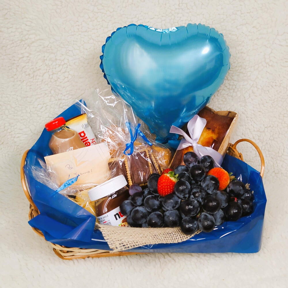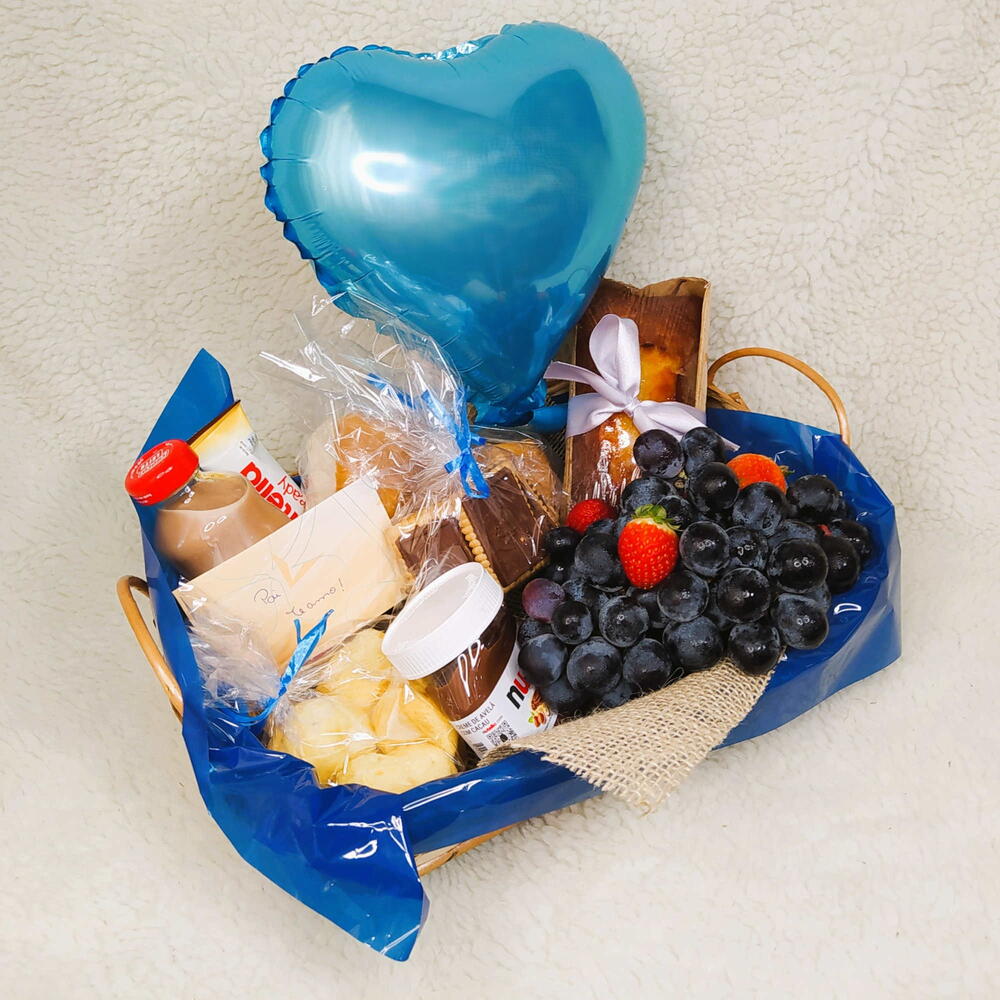 pães de queijo - 3 un. chocoleite - 1 un. nutela - 1 un. biscoito com chocolate - 1 un. bisnaguinha - 4 un. bolo 220g - 1 un. morango e uvas - 1 un. balão coração m - 1 un. bandeja vime m - 1 un.