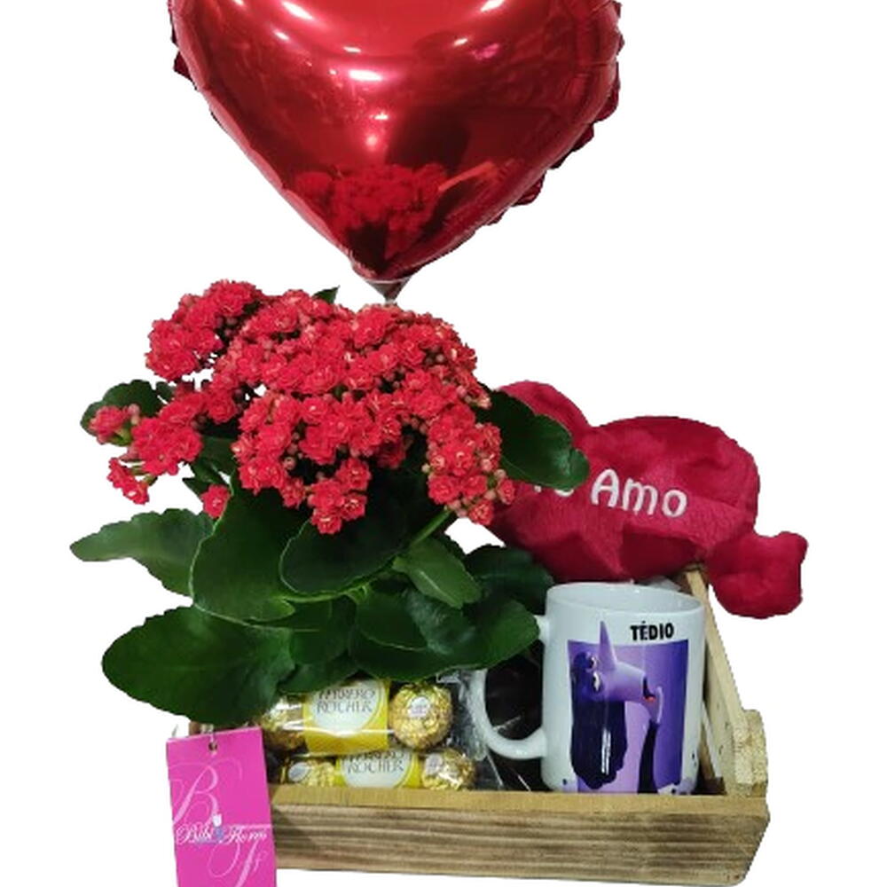 caneca personalizada - 1 un. bombons ferrero rocher - 3 un. kalanchoe - 1 un. bandeja de madeira - 1 un. balão metalizado em formato de coração - 1 un. pelúcia estilo coração pp - 1 un.
