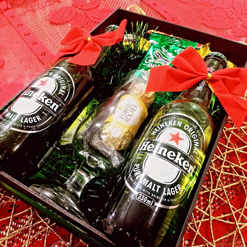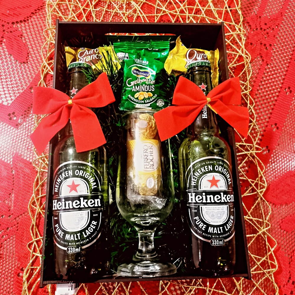 Bandeja Hineken - Sofisticação para Celebrar Descrição: Eleve o momento especial com a nossa Bandeja Hineken! Um presente impressionante e refinado, perfeito para aniversários, conquistas ou uma noite memorável. Este conjunto premium inclui: · 2 cervejas long neck Hineken · 1 taça de cerveja exclusiva · 1 Ferrero Rocher · 2 chocolates Ouro Branco · Amendoim torrado para acompanhar · Um delicado fio de fada, iluminando a celebração Mais que um presente, é uma experiência. Perfeito para quem aprecia o bom gosto.