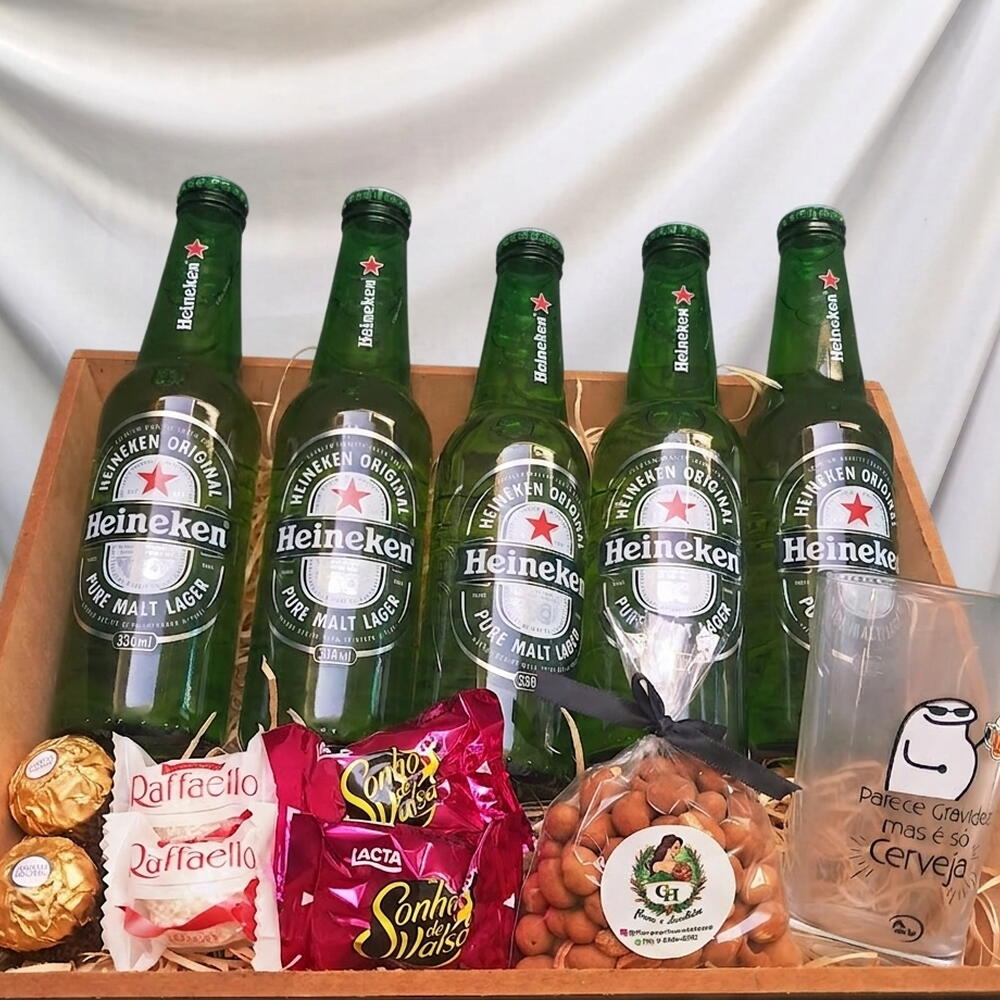 Bandeja premium com cervejas, chocolates e copo. O presente mais completo para cervejeiros. Cerveja Budweiser Heineken+R$ 6,00
