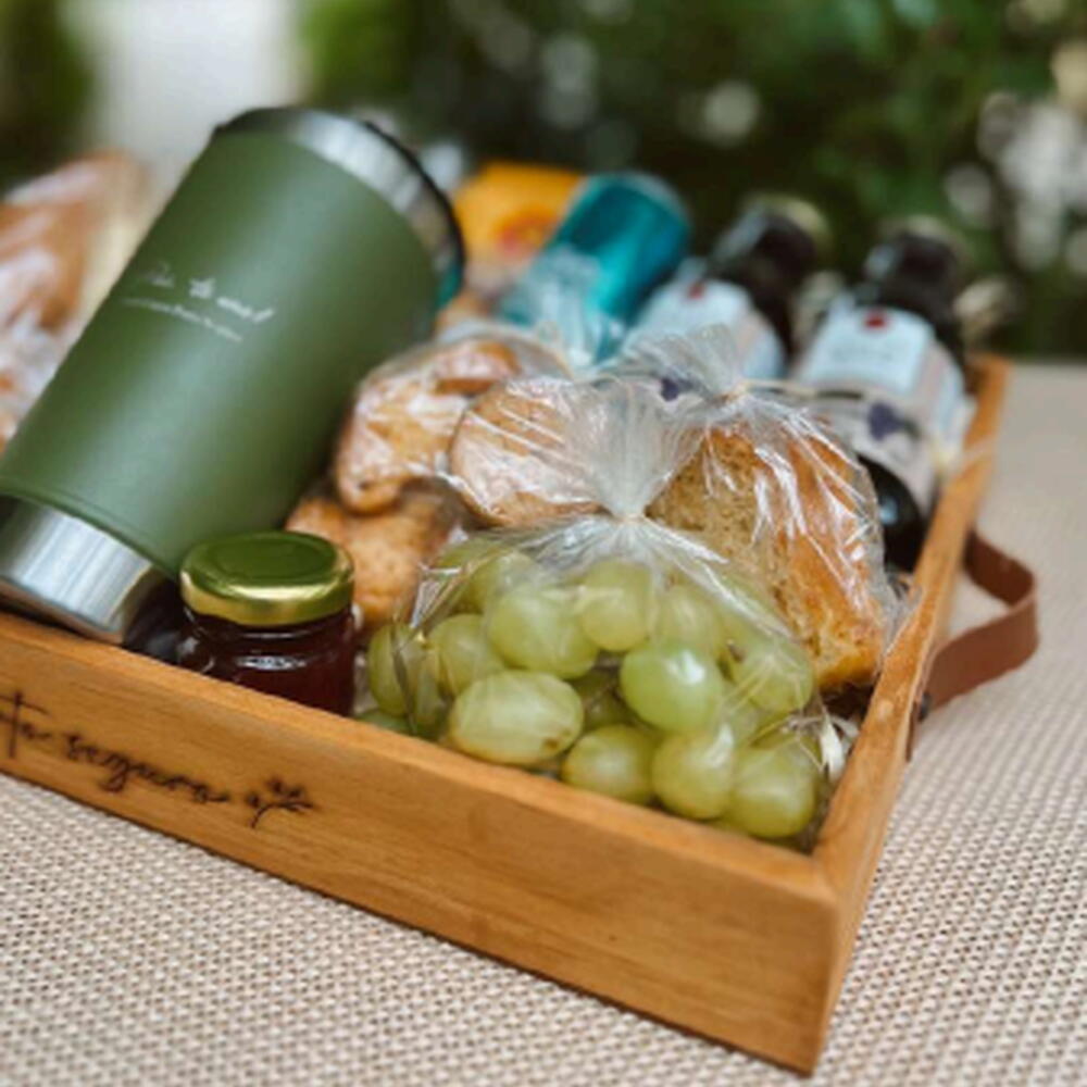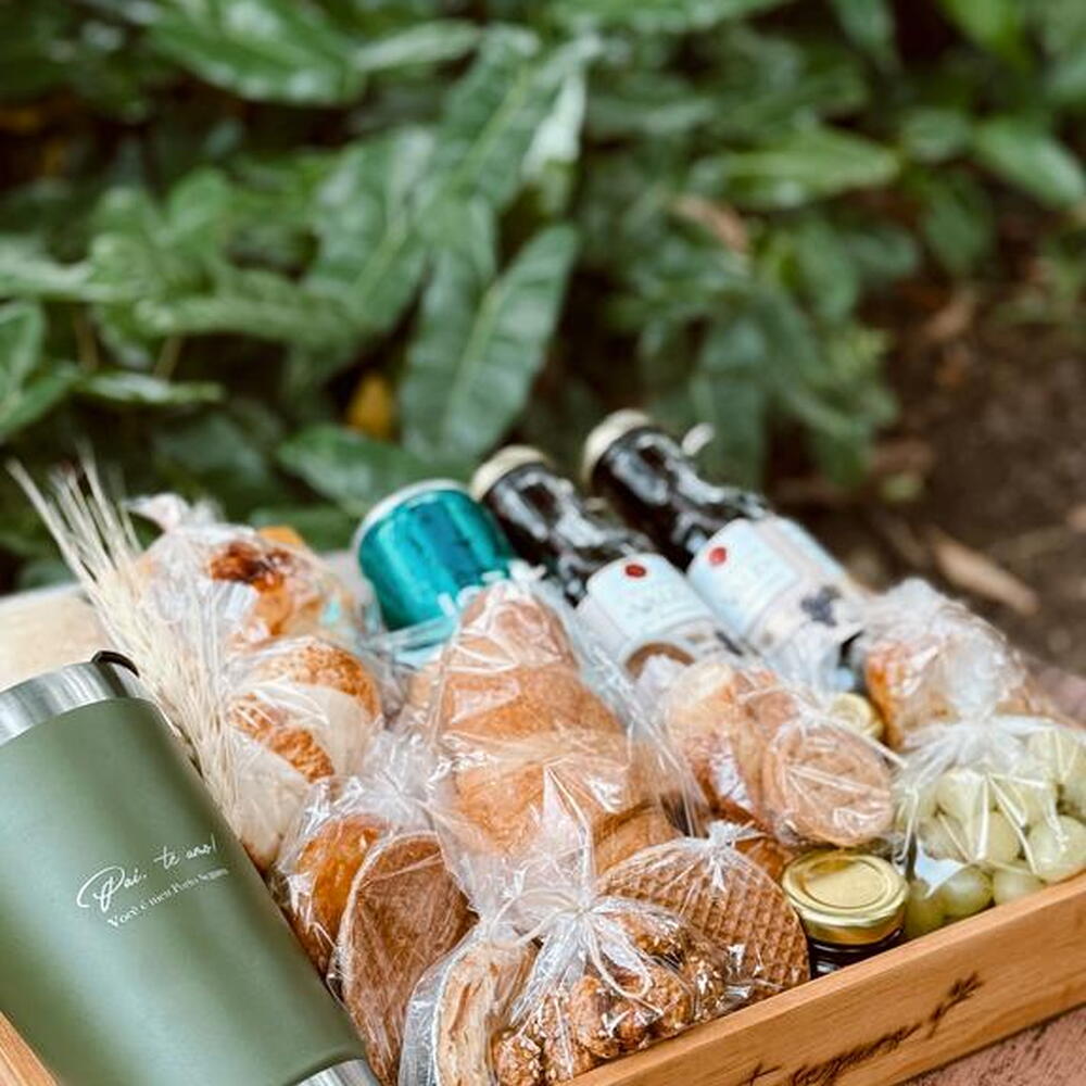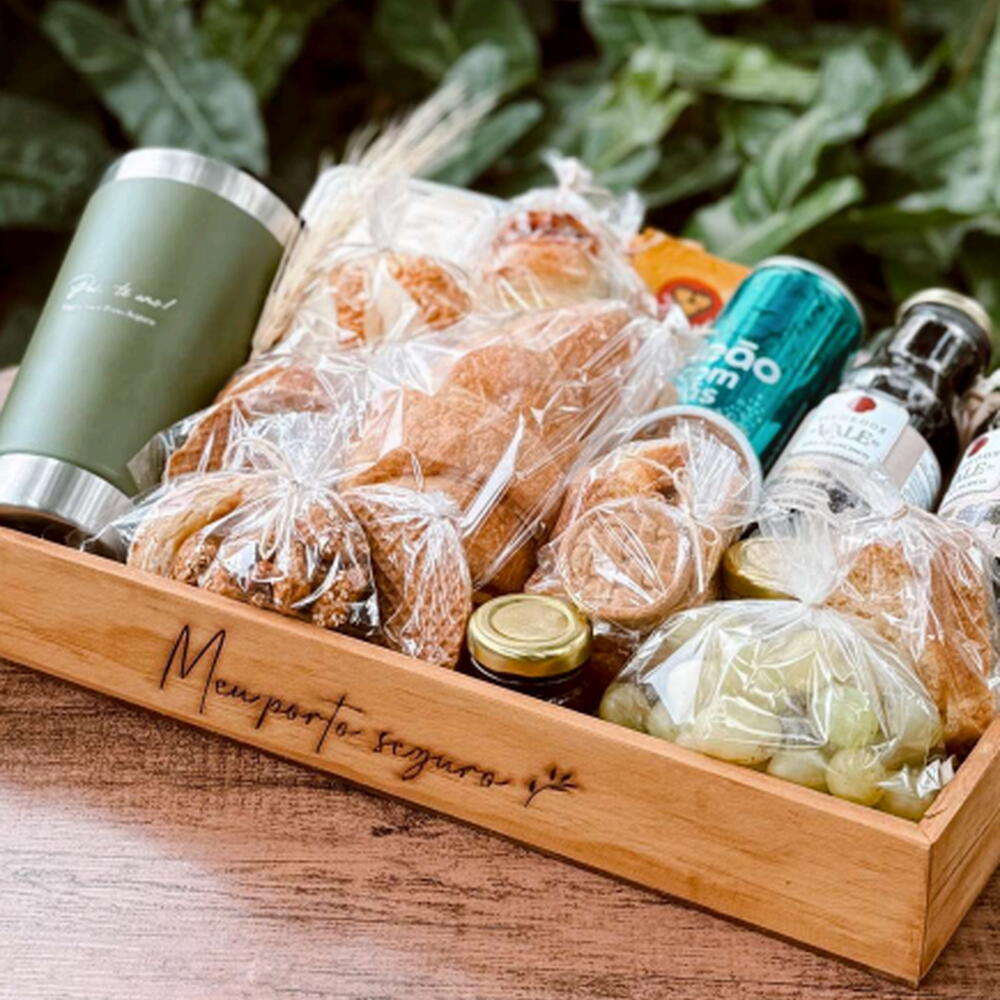 croissant - 1 un. biscoito amanteigado - 1 un. chocolates - 2 un. pão de mel - 1 un. torrada - 1 un. pão doce - 1 un. cookie - 1 un. frutas da estação - 2 un. copo térmico - 1 un. doce de leite - 1 un. cafés - 2 un. potinho de geléia - 1 un. quiche - 1 un. castanha caramelizada - 1 un. stroopwafel holandês - 1 un. rocambole - 1 un. pães delícia - 4 un. mini sanduíche - 1 un. pastel de belém - 1 un. sucos integrais de uva - 2 un. murffin - 1 un. chá mate leão - 1 un. patê de queijo do reino - 1 un.