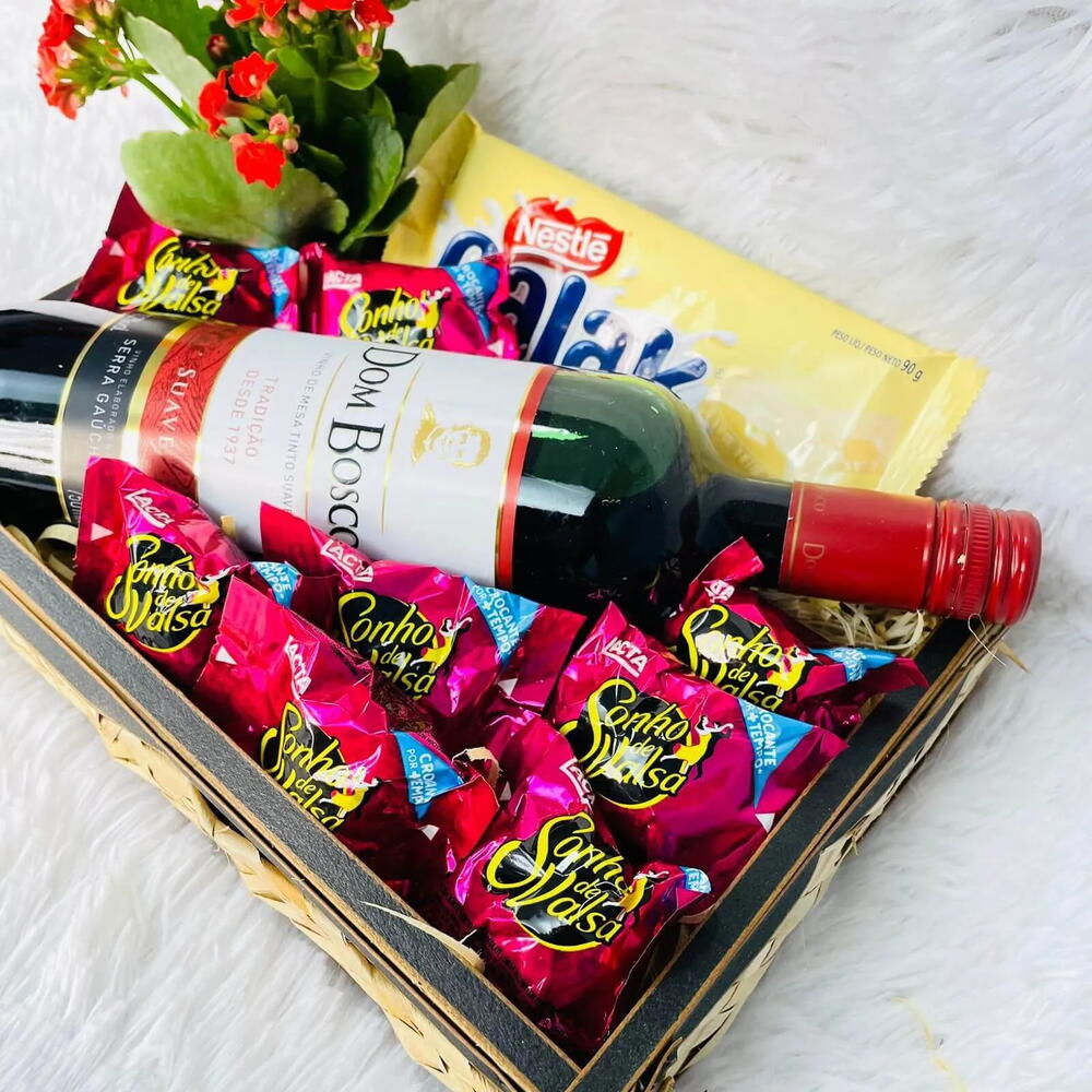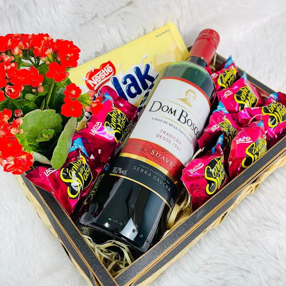 barra de chocolate - 1 un. vinho 750ml - 1 un. bombons - 8 un. pote de kalanchoe - 1 un. bandeja p - 1 un. embrulho transparente - 1 un.
