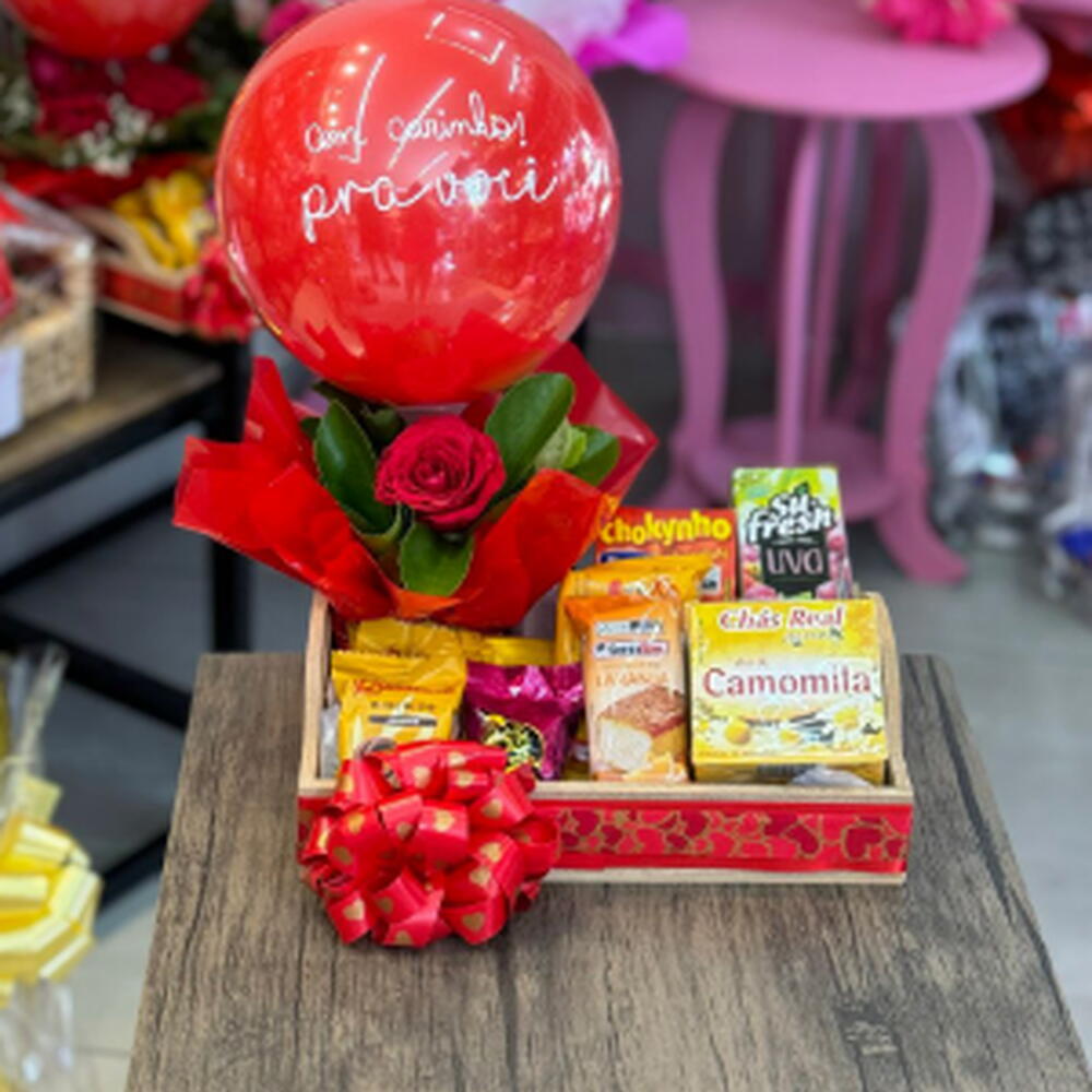 suco - 1 un. bolinho - 1 un. torrada - 1 un. chá - 1 un. achocolatado - 1 un. bombons - 2 un. biscoitos - 3 un. balão personalizado - 1 un. linda rosa vermelha com folhagens - 1 un.