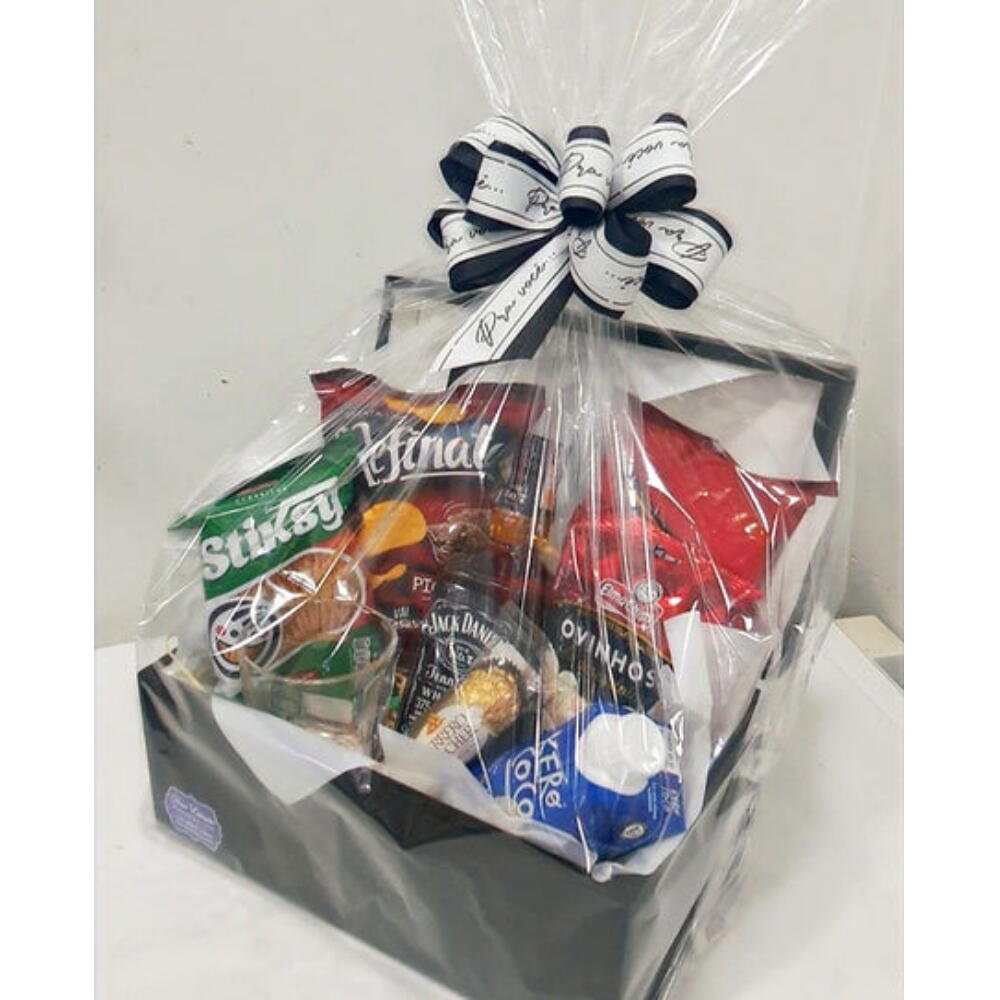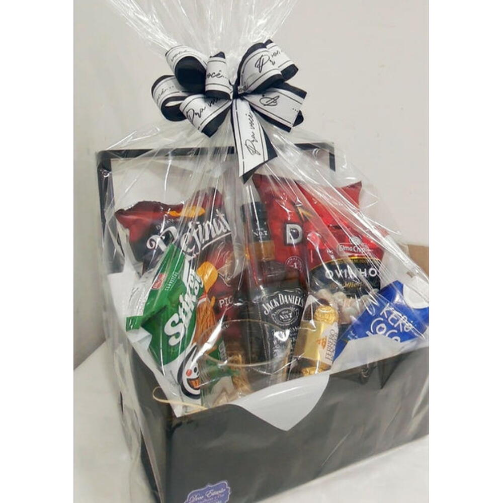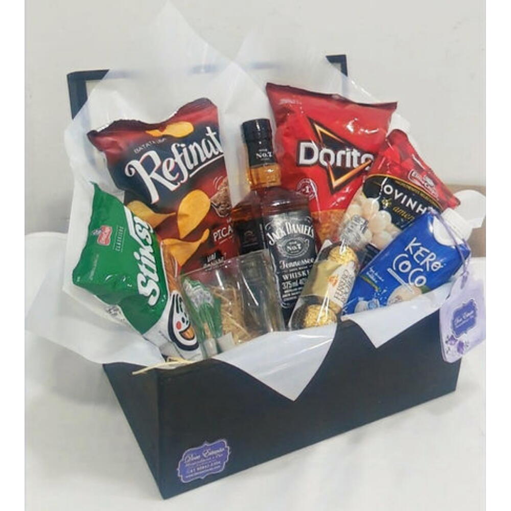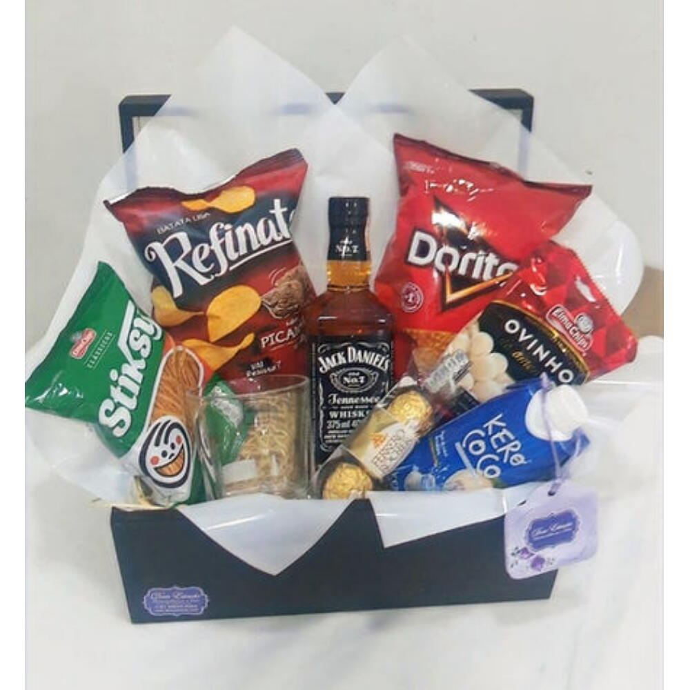 Este presente é uma combinação perfeita para apreciadores de whisky. Dentro de um estiloso baú de madeira, você encontrará uma garrafa de 375 ml de whisky Jack Daniels, famosa por seu sabor robusto e suave. Acompanha uma água de coco para refrescar o paladar e um sofisticado copo de whisky para desfrutar dessa bebida requintada. Além disso, este conjunto inclui uma variedade de petiscos para realçar ainda mais a sua experiência, como um pacote de Doritos, uma batatinha, palitos salgados e tentadores ovinhos de amendoim. Para deixar essa experiência ainda mais doce, incluímos um Trio Ferrero Rocher. O presente perfeito para comemorar qualquer ocasião especial. OBS.: Na falta de qualquer produto, o mesmo podera ser substituido por outro similar.