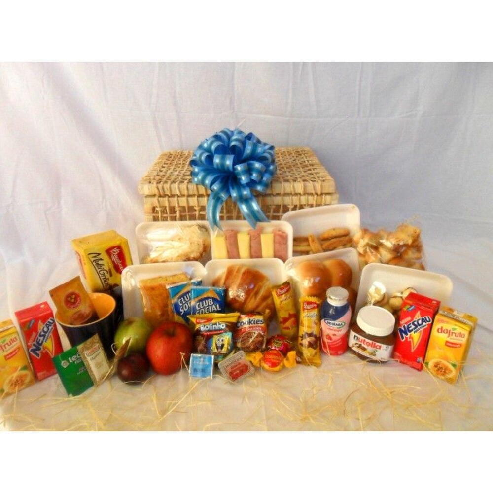 croissant - 1 un. maçã - 1 un. presunto - 1 un. torrada bauducco 160g - 1 un. pera - 1 un. uva - 1 un. pão de queijo - 1 un. sachê de chá - 1 un. achocolatado 200ml - 2 un. pães de leite - 1 un. suco de frutas 200ml - 2 un. sachê de açúcar - 1 un. mussarela - 1 un. cookie bauducco 32g - 1 un. fatias de bolo - 1 un. *brinde: uma caneca* - 1 un. iogurte 180g - 1 un. biscoitos club social 26g - 2 un. nutella 170g - 1 un. biscoitinho de orégano - 1 un. biscoitinho de goiaba - 1 un. bolacha acebolada - 1 un. bombom de chocolate (sonho de valsa ou ouro branco) - 1 un.