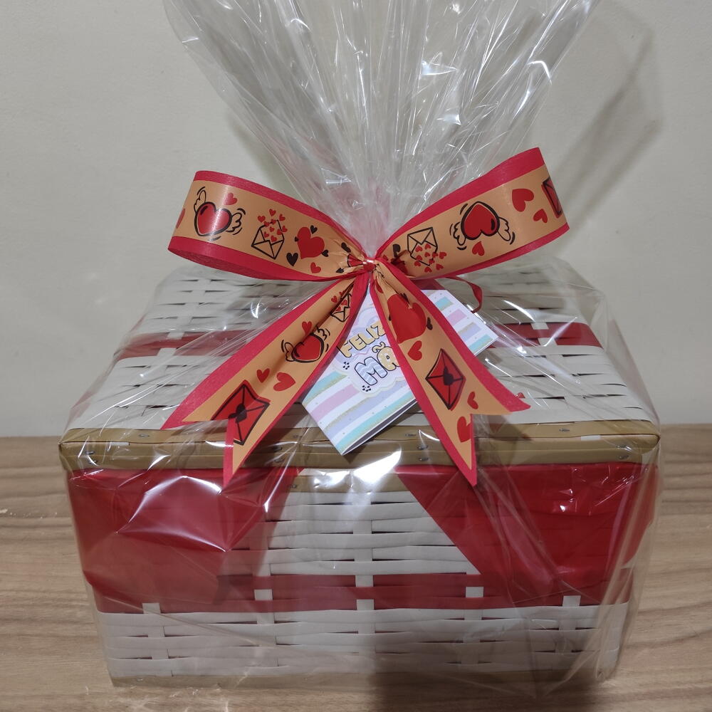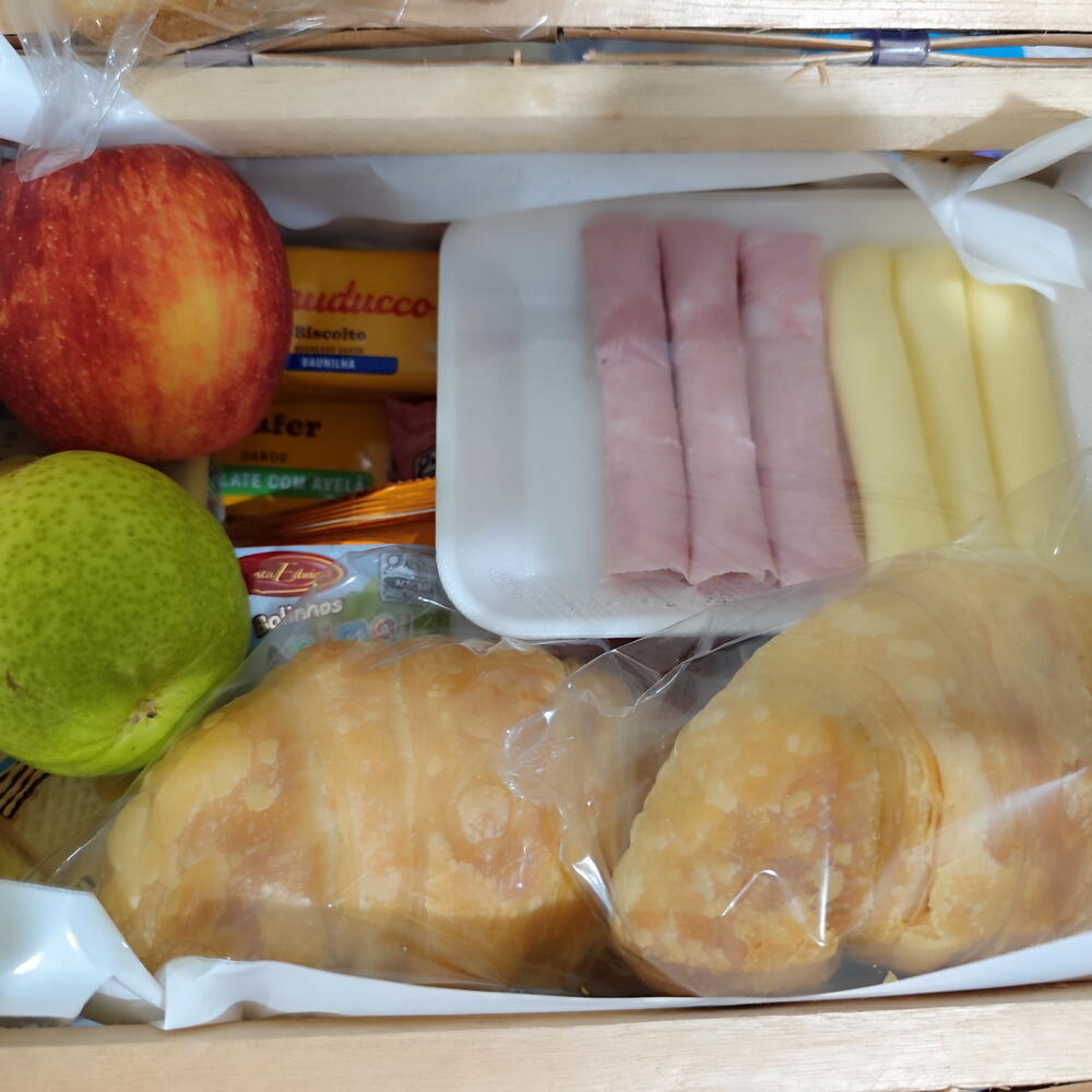 produto. PRODUTOS QUE ACOMPANHAM A CESTA: Brinde: - 1 Caneca de porcelana Com logo da Loja ou tematica conforme disponibilidade, consulte a loja antes Bebidas e Sucos: - 1 achocolatado - 1 Capuccino - 1 Chá Sachê - 1 Bebida Lactea Frutas: - 1 Frutas da época Biscoitos: - 2 Biscoitos Amanteigados - 1 Bolacha Recheada -1 Mini Bolacha Salgada - 1 Caixa Tubin Doces: - 2 Geleias Blister Frios: - 1 Patê - 3 Fatias de queijo - 3 Fatias de presunto - 1 Mini Margarina - 1 Mini Manteiga - 1 Queijo Processado Polenguinho Panificação: - 2 Torradas - 2 Fatias de pão branco - 2 Fatias de pão centeio Salgados: - 2 Salgados variados (Sfiras, pão de batata recheado, Croissant, conforme disponibilidade da loja) Complementos: - 2 Sachês de açúcar - 2 Sachês de adoçante Embalagem: - 1 Baú tamanho aproximado 31x22x14cm - 1 Pacote celofane Decoração: - Fitas - Laços Observações: - Na falta de qualquer item o mesmo será substituído por outro de mesmo valor. Decoração pode conter alterações por se tratar de artesanato.