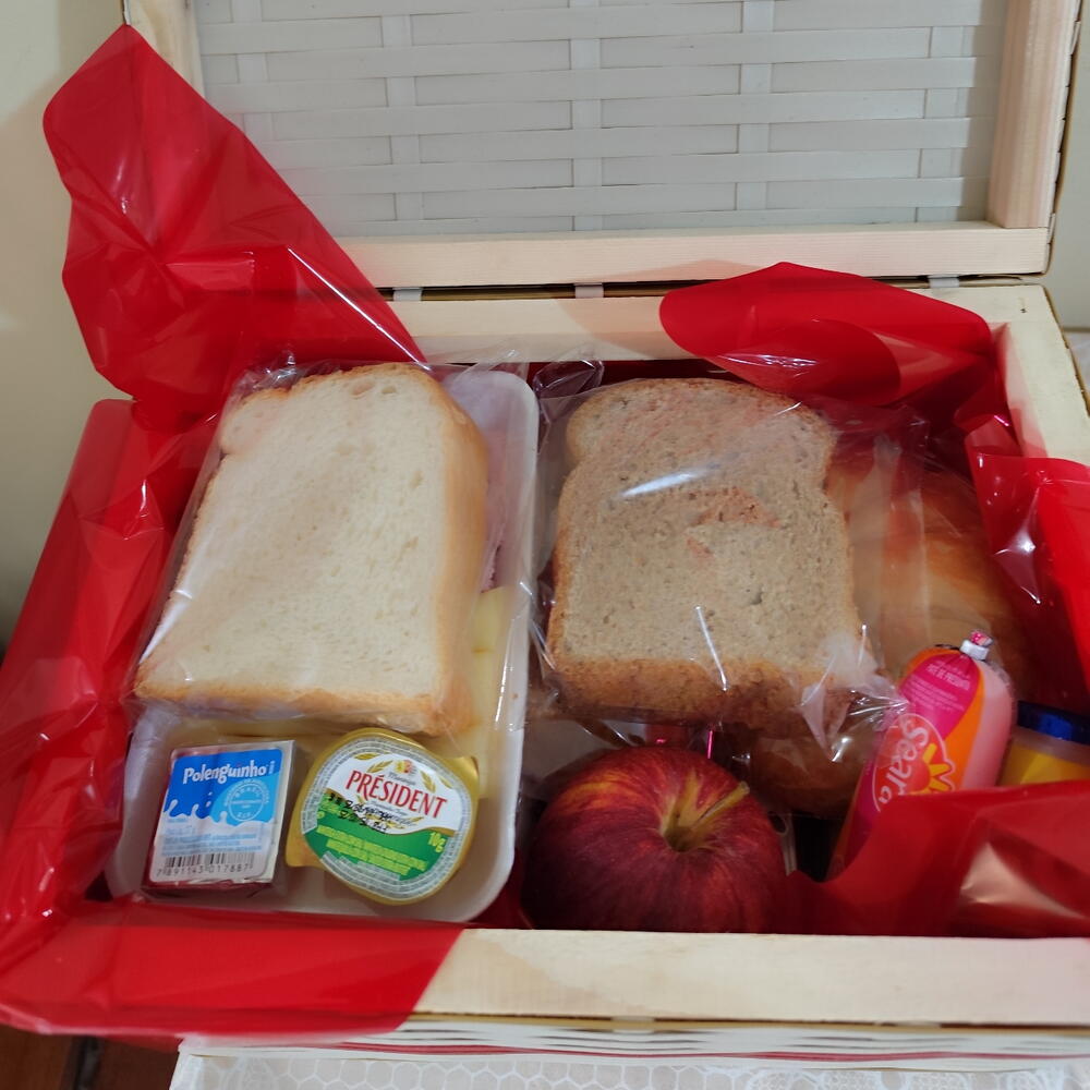 torradas - 2 un. iogurte - 1 un. barrinha de cereal - 1 un. laço - 1 un. pão de mel - 1 un. club social - 1 un. bolinho - 1 un. achocolatado - 1 un. cream cheese - 1 un. cappuccino - 1 un. fatias de queijo - 2 un. fatias de presunto - 1 un. mini manteiga - 1 un. frutas da época - 2 un. biscoito belvita - 1 un. maxi goiabinha - 1 un. embalagem celofane - 1 un. suco caixinha - 1 un. biscoitos maria - 1 un. bebida láctea - 1 un. pães bisnaguinha - 3 un. mini bolacha salgada - 1 un. docinhos ducrem - 1 un. fatias de pão branco - 3 un. fatias de pão centeio - 3 un. amanteigados banana c canela - 1 un. amanteigados chocolate - 1 un. observações: - na falta de qualquer item o mesmo será substituído por outro de mesmo valor. decoração pode conter alterações por se tratar de artesanato. - 1 un. bandeja salame fatiado - 1 un. sachês de açúcar e sachês de adoçante - 4 un. baú 34x26x16cm - 1 un. amanteigados côco ou leite - 1 un. biscoit tubin recheado - 1 un. blister geleias - 2 un. patê bisnaga - 1 un. cereais matinal - 1 un.