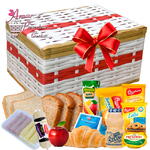 Desfrute de um café da manhã completo com esta linda Cesta de Café da Manhã. Composto por uma diversa seleção de produtos frescos e deliciosos, como suco caixinha, frutas da época, bolinhos e biscoitos, além de deliciosos itens salgados como salame fatiado, torradas, fatias de queijo e presunto. A cesta também inclui cereais matinais, iogurte refrescante e um conjunto de guloseimas adoçadas para complementar o seu paladar. O pacote de presente está incluído nesta cesta refinada, decorada à mão e apresentada em um baú elegante. Por favor, note que os itens podem variar de acordo com a disponibilidade e que a decoração artesanal pode sofrer alterações. Desfrute de uma manhã saborosa e variada com esta cesta de café da manhã elegante e bem pensada.