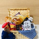 queijo mussarela - 1 un. caneca de porcelana - 1 un. suco de uva integral - 1 un. bolo de laranja - 1 un. blister de geleia - 2 un. torradinhas - 1 un. requeijão - 1 un. biscoito wafer - 1 un. sachês de cappuccino - 2 un. cartão de felicitações - 1 un. garrafinha de iogurte - 1 un. pão recife - 1 un. queijo do reino (fração) - 1 un. bolo de rolo (fatiado) - 1 un. brownie (fatiado) - 1 un. frutas (maça e pêra) - 1 un. patê sadiaseara - 1 un. pão artesano (3 fatias) - 1 un. baú de vime 25 x 35 cm - 1 un.