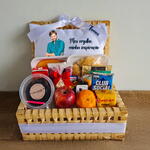sachê de café - 1 un. sachê de chá - 1 un. achocolatado 200ml - 1 un. suco 200ml - 1 un. geléia - 1 un. sachês de adoçante - 2 un. sachês de açúcar - 2 un. frutas da estação - 2 un. fatias de presunto - 2 un. croissants - 3 un. queijo polenguinho - 1 un. fatia de queijo - 1 un. pacote de torradas - 1 un. cartão dedicatória - 1 un. mini tortinha 120g - 1 un. chocolate recheado - 1 un. mini bolo de café (sabor baunilha) - 1 un. pacote de bolachas club social - 1 un. embalagem com sequilhos 45g - 1 un. vela de aniversário - 1 un. almofada personalizada tamanho 20x29 cm personalizada - 1 un. baú em vime tamanho médio - 1 un. decorado com fita de cetim com o nome do presenteado gravado - 1 un.