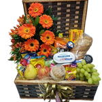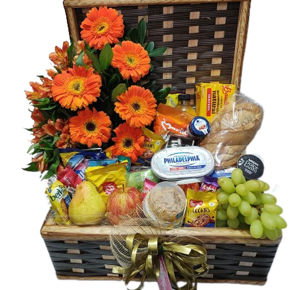 Composição: O Baú de Café da Manhã Import é um verdadeiro tesouro para começar o dia! Com 29 itens deliciosos, inclui um arranjo vibrante com 6 Gerberas e Alstromerias,