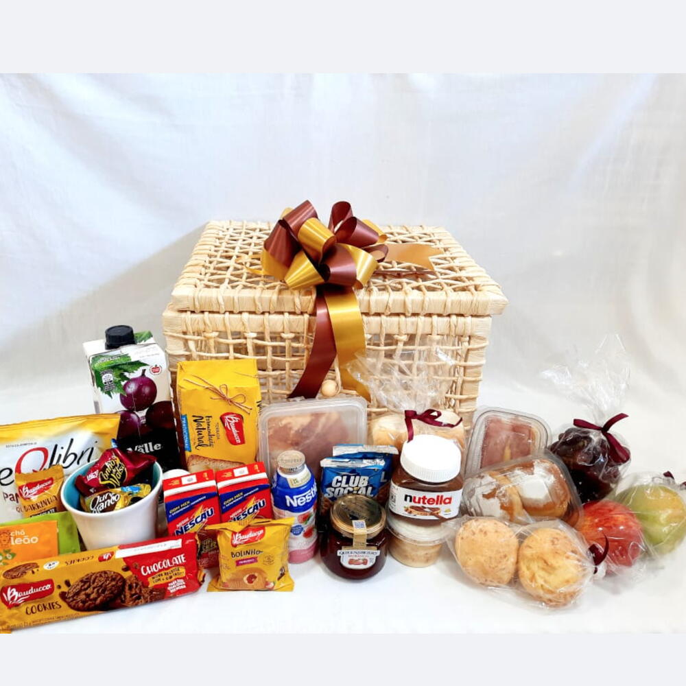 iogurte - 170 gr. maçã - 1 un. presunto - 1 un. bolinho bauducco - 1 un. torrada bauducco - 1 un. pera - 1 un. sachês de açúcar - 2 un. pães de leite - 1 un. suco de frutas - 1000 ml sachês de chá - 2 un. cacho de uvas - 1 un. mussarela - 1 un. cookie bauducco - 1 un. fatias de bolo - 2 un. biscoitos salgados (club social) - 2 un. creme de avelâ (nutella) - 1 un. pote de geléia (queensberry) 320g - 320 gr. torrada equilibri panetini - 1 un. croiassant - 1 un. *brinde: caneca* - 1 un. 2 achocolatados (200 ml) - 200 ml chocolates (sonho de valsa serenata de amor ou ouro branco) - 1 un.