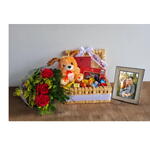 chocolates - 10 un. laço - 1 un. embalagem celofane - 1 un. buquê com 3 rosa - 1 un. baú artesanal em palha - 1 un. caixa com 7 corações de chocolate ao leite da cia do cacau - 70 gr. mensagem de chocolate ao leite. você é especial - 45 gr. porta-retrato com foto impressa (tamanho 10x15 cm) - 1 un.