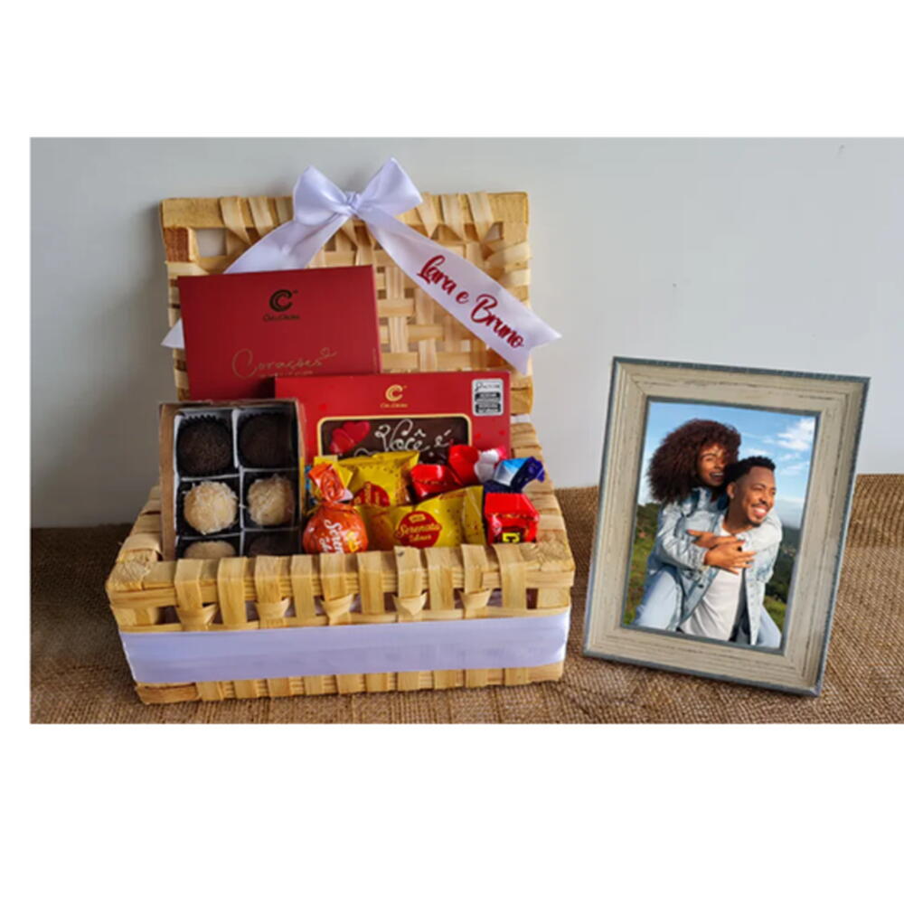 embalagem celofane - 1 un. chocolates sortidos - 10 un. laço rústico - 1 un. porta-retrato com foto impressa (tamanho 10x15 cm) - 1 un. cartinha dedicatória - 1 un. caixa com 7 corações de chocolate ao leite da cia do cacau (70g). - 1 un. mensagem de chocolate ao leite (45g): você é especial - 1 un. caixa com docinhos: 2 brigadeiros +2 beijinhos + 2 bem-casados - 1 un. baú artesanal em palha decorado com fita de cetim com o nome do presenteado gravado - 1 un.