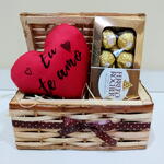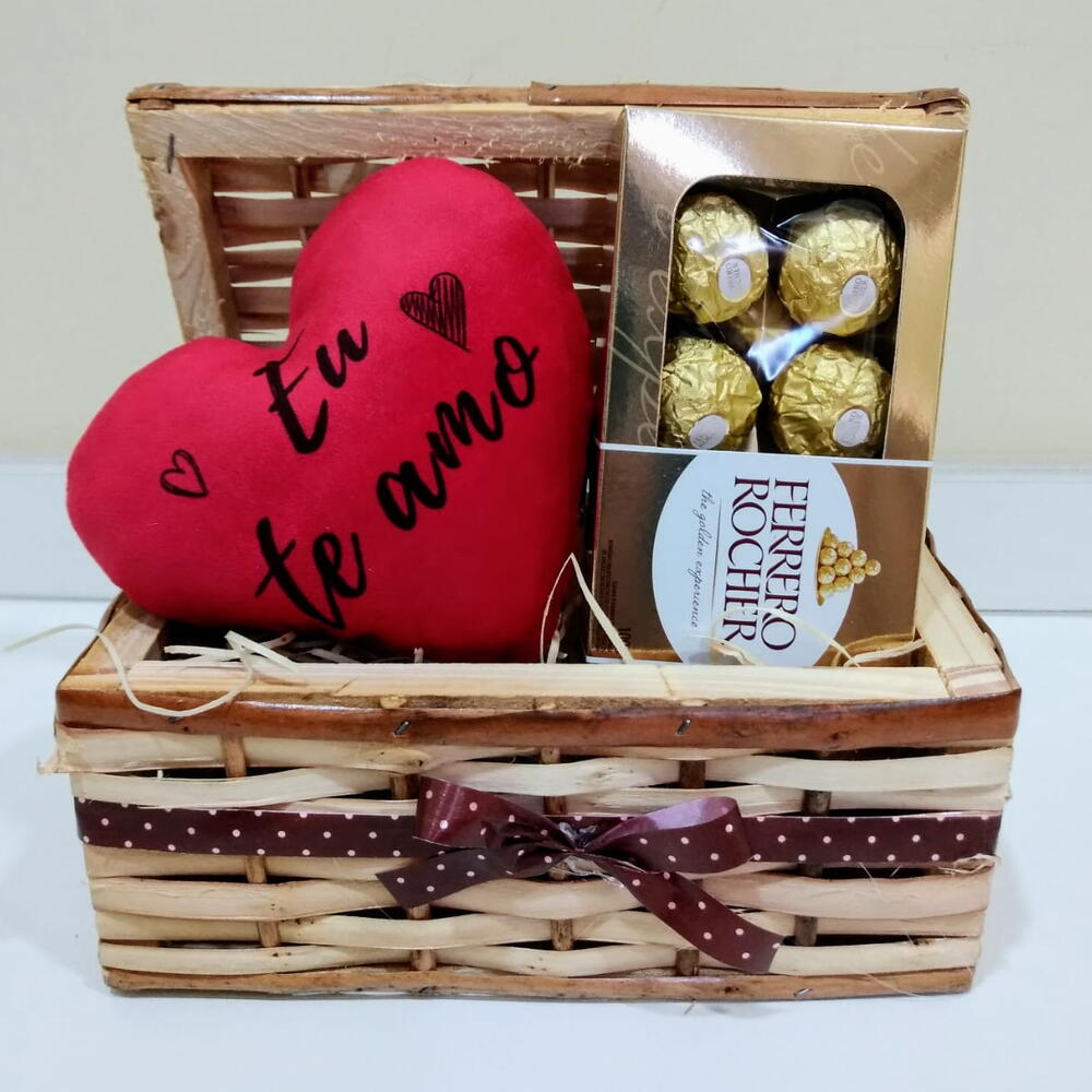 Este produto é a quintessência do amor em forma de cesta. Cuidadosamente preparado, contém uma suculenta almofadinha de coração estampada com a tão sincera frase Eu te amo. Não irá apenas surpreender o destino, mas também derreterá o seu coração. Além disso, a cesta inclui um irresistível Ferrero Rocher, o chocolate de luxo que o fará sentir-se especial em cada mordida. Elaborado com ingredientes de alta qualidade, com todo o carinho e cuidado que só a personalização oferece. Perfeito para ocasiões especiais ou simplesmente para demonstrar o quanto a pessoa amada é importante.