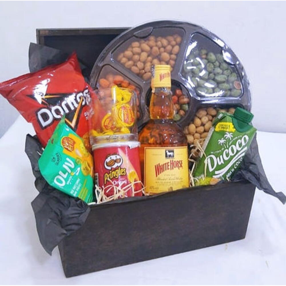 Este presente exclusivo de bebida é perfeito para qualquer adulto distinto. Contido em um robusto baú de madeira, você encontrará uma variedade de guloseimas exuberantes. Desfrute de um saboroso White Horse de 375 ml, suavemente complementado por uma refrescante água de coco. Este pacote também inclui um Doritos saboroso, uma lata de Pringles crocantes, azeitonas aperitivas suculentas e um delicioso trio Ferrero Rocher. Para completar este conjunto gourmet, há um mix de amendoins em uma bandeja e um elegante copo para Whisky. É a combinação ideal de guloseimas doces, salgadas e bebidas para qualquer amante da boa vida. Um presente que certamente impressionará! OBS.: Na falta de qualquer produto, o mesmo podera ser substituido por outro similar.