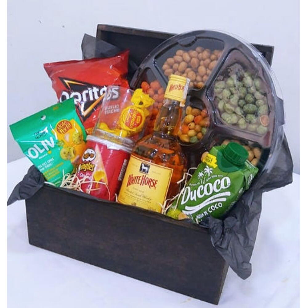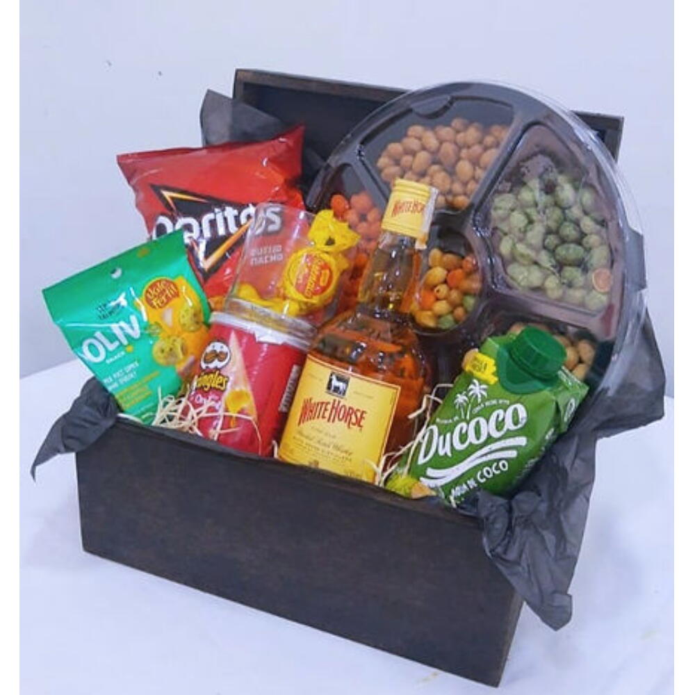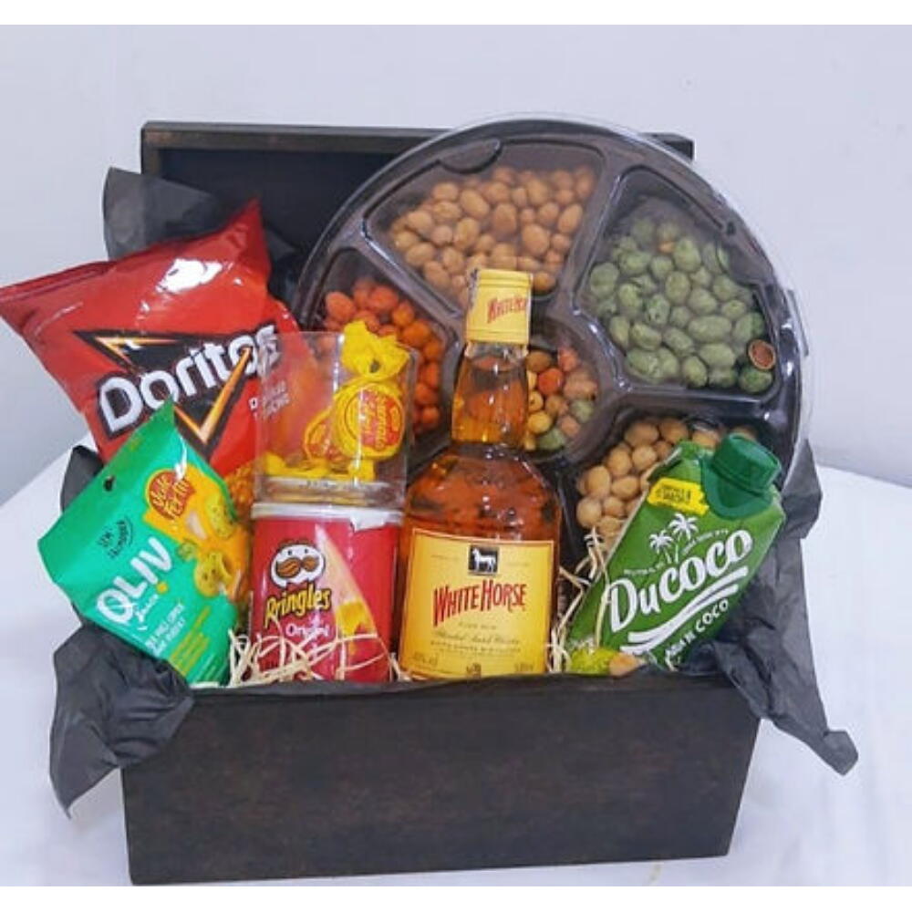 água de coco - 1 un. doritos - 1 un. trio ferrero rocher - 1 un. bau de madeira - 1 un. copo para whisky - 1 un. white horse 375 ml - 1 un. latinha pringles - 1 un. azeitona aperetiva - 1 un. bandeija mix de amendoins - 1 un.