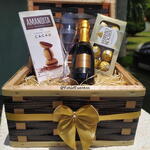 ferrero de 8 unid - 1 un. caixa amandita - 1 un. chandon baby 175ml - 1 un. taça de champanhe - 1 un. caixote trançado grande - 1 un.