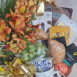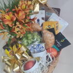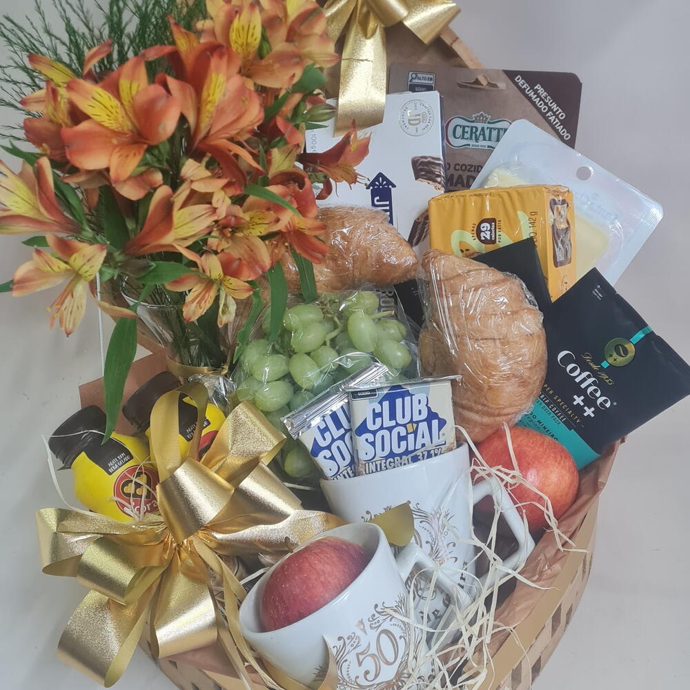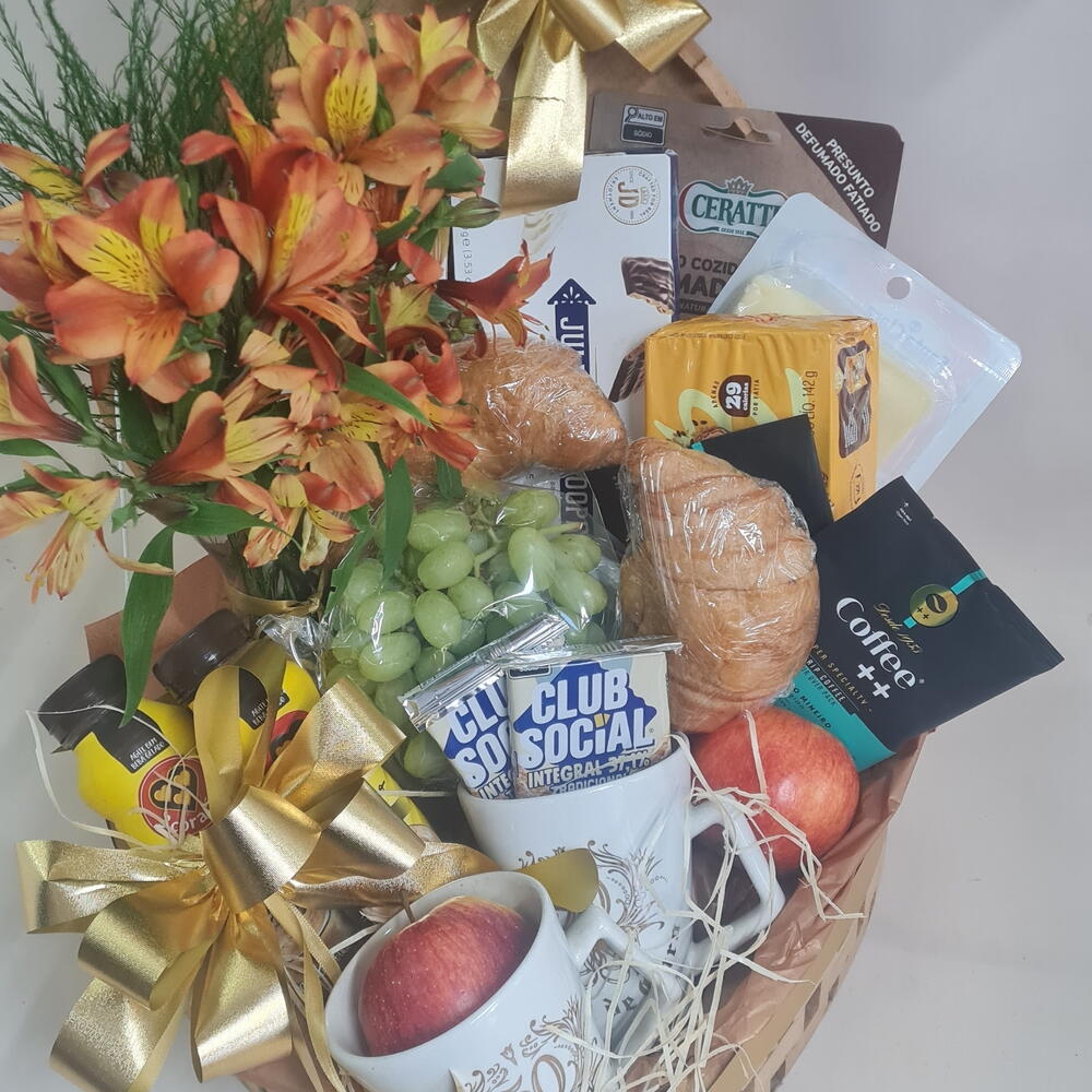 frutas - 2 un. croissant - 2 un. torrada - 1 un. caixa coração - 1 un. queijo e presunto - 1 un. caneca 50 - 2 un. biscoito importado - 1 un. chocolate 3 corações liquido - 2 un. café e capuccino - 4 un. arranjo de austroemerias - 1 un.