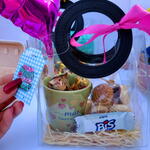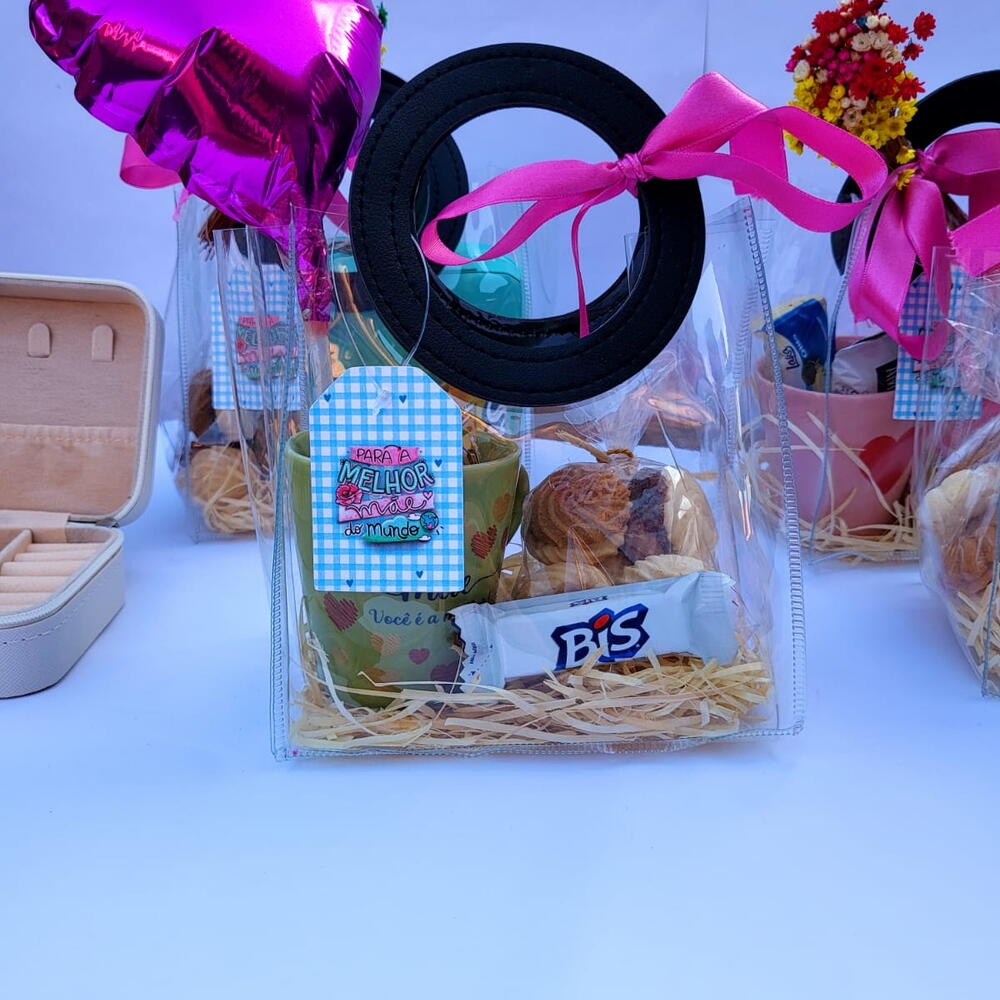laço de cetim - 1 un. balão - 1 un. caneca personalizada de porcelana - 1 un. porção de biscoitos - 1 un. bombons sortidos lacta - 3 un.