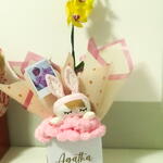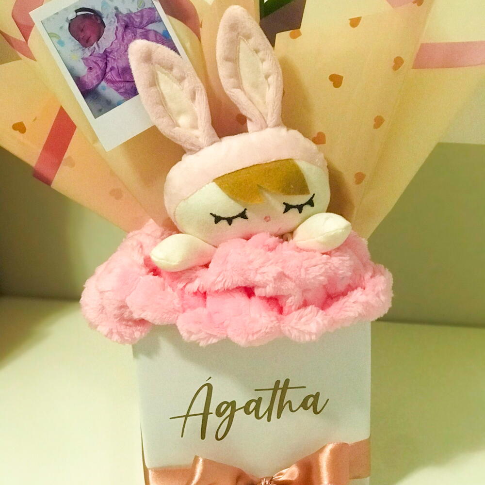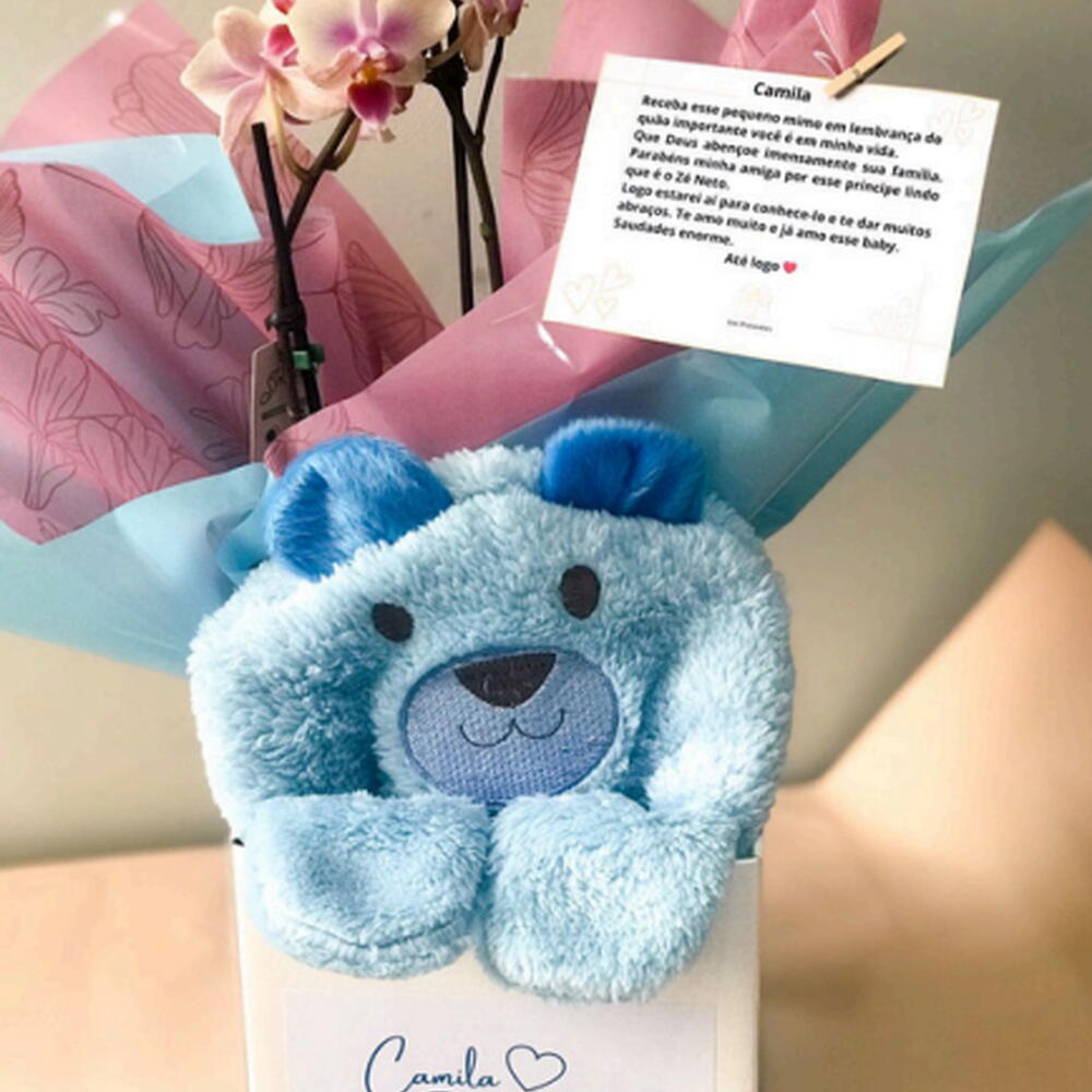 embalagem - 1 un. caixa personalizada - 1 un. box (caixa) - 1 un. orquídea m - 1 un. kit touca + meia - 1 un. cartão personalizado ou foto - 1 un.