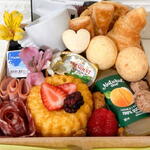 pão de queijo - 2 un. mini bolo - 1 un. morango - 1 un. bandeja - 1 un. mini manteiga - 1 un. xícara - 1 un. wafle - 1 un. lombo - 1 un. polenguinho; - 1 un. suco natural one; - 1 un. sfogliatine italiano folhado - 2 un. salame 30g - 1 un. croissant folhado de manteiga - 1 un. uva (cacho) - 1 un. bolachinha caramelada - 1 un.