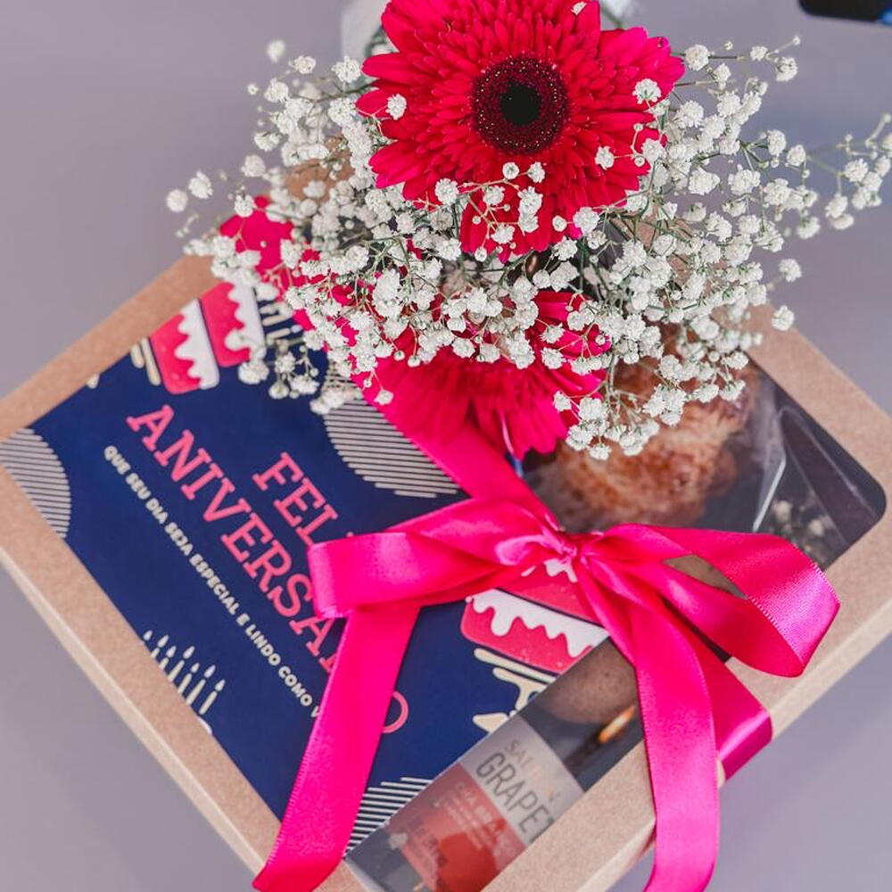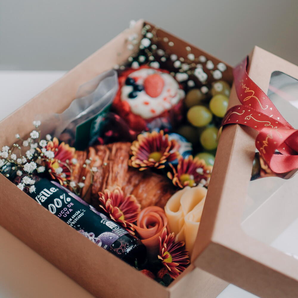 Box Amor a Dois Composto por suco de uva integral, café ou chá, pão de queijo, croissant, bolo, lombo e queijo, geleia, cookies. *Na falta de algum item será substituído por um de mesma categoria ou superior. Box de café para 2 pessoas. Acompanha caixa e cartão conforme ocasião.