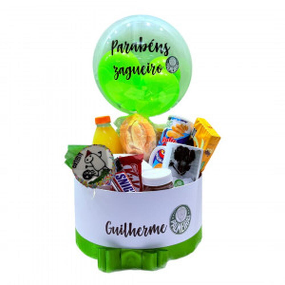 Surpreenda com o Box Aniversário Bolo Cake personalizado Palmeiras, com lanche completo, doces e balão exclusivo. Presente ideal para fãs do time que querem comemorar com estilo e sabor.
