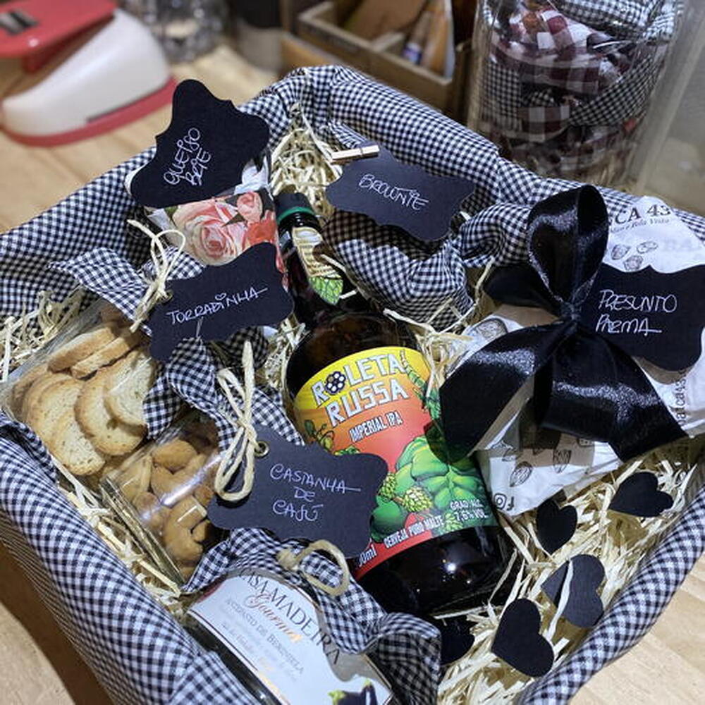 box - 1 un. cesta - 1 un. brownie - 1 un. torradinhas - 1 un. queijo brie - 1 un. cerveja artesanal - 1 un. castanha caju - 1 un. copa - 1 un. laço rústico - 1 un. laço em cetim - 1 un. tecido decorativo - 1 un. antepasto de berinjela - 1 un.