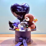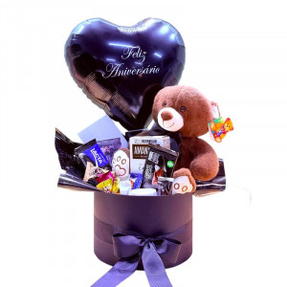 nutella - 1 un. caixa de bombom lacta - 1 un. chocolate amandita - 1 un. urso médio - 1 un. barra de chocolate diamante negro - 2 un. balão de coração na cor preta - 1 un. box cartoanada para viagem - 1 un.